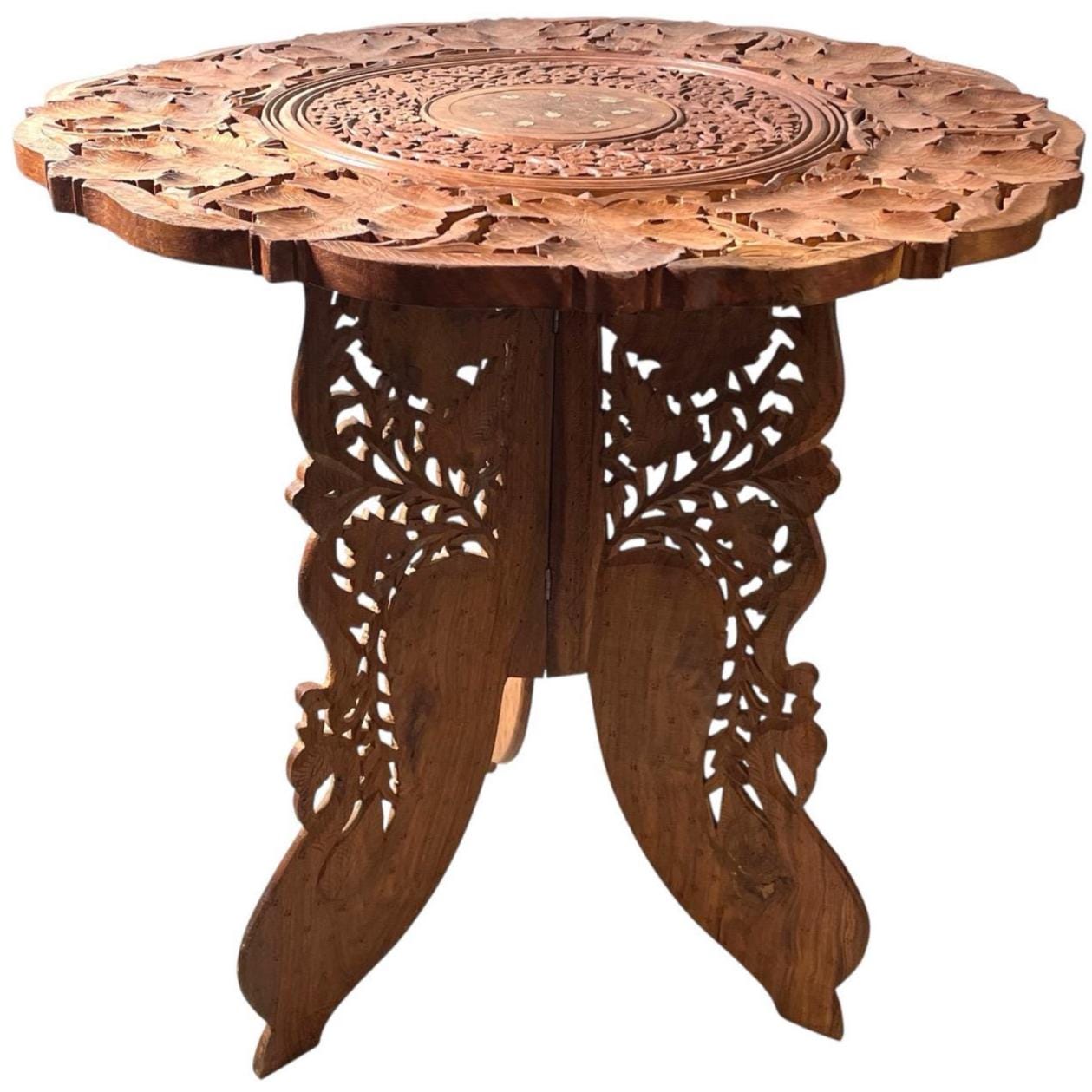 A vintage Indian folding leg table with inlaid metal flower design top. We often have these pass through the store but not usually this large and with suck ornately carved top. Has signs of age and previous use as detailed below.