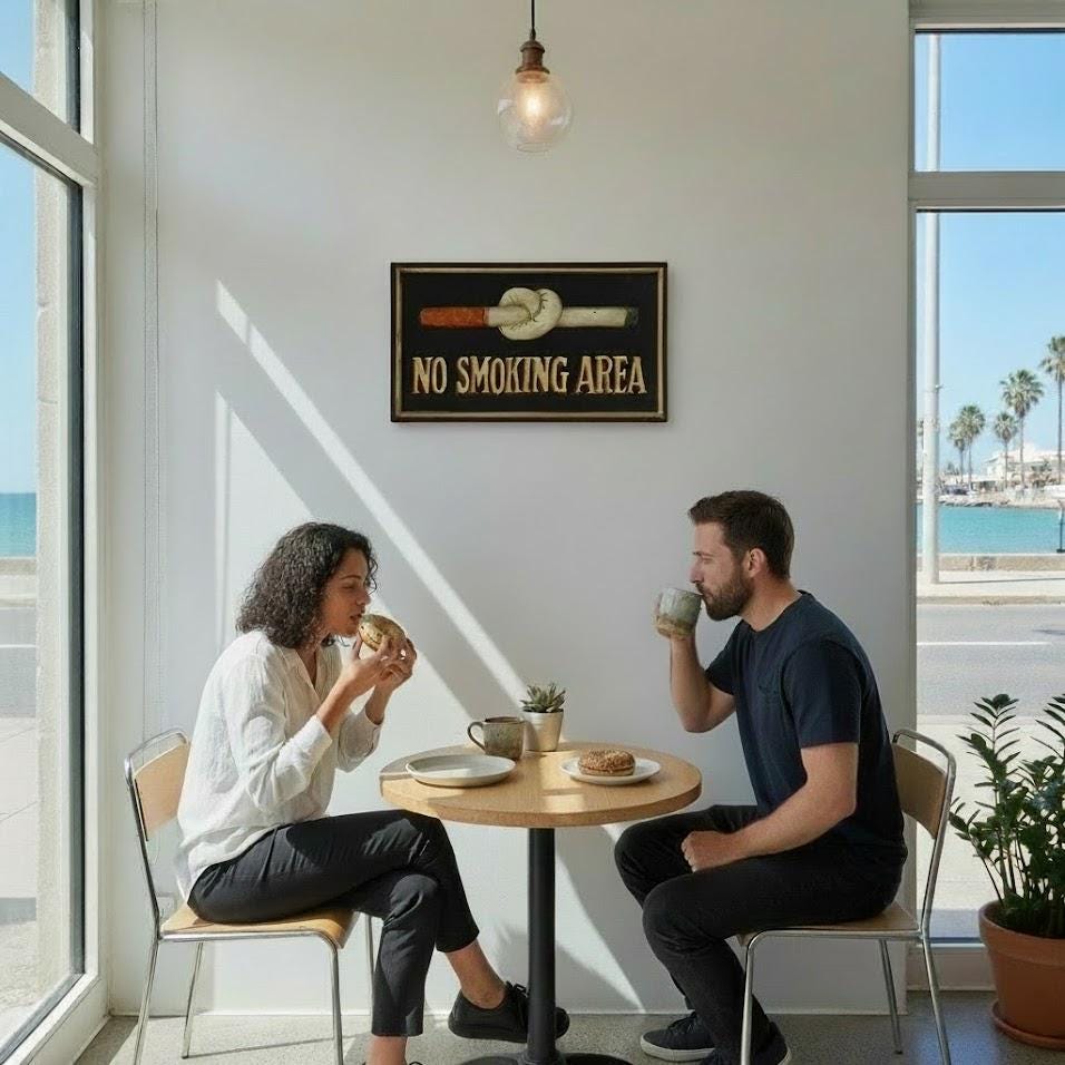 This “No Smoking Area” sign, featuring a cigarette tied in a knot, likely served as a decorative or functional warning in public spaces or private establishments. Such signs became more prevalent as smoking bans and restrictions began to be implemented, particularly in the mid to late 20th century. The artistic rendering of the cigarette suggests a desire to make a functional sign more visually engaging or even humorous.
