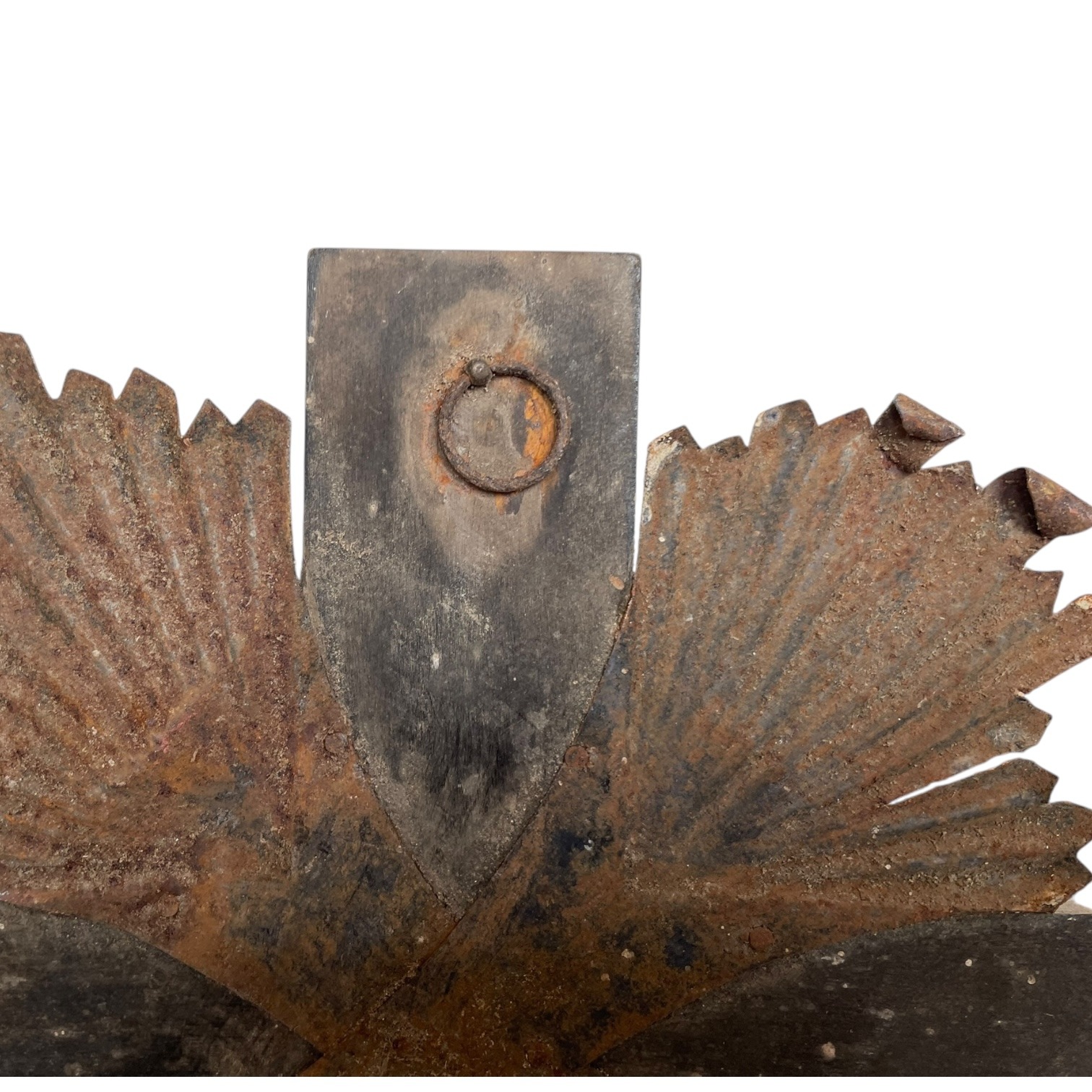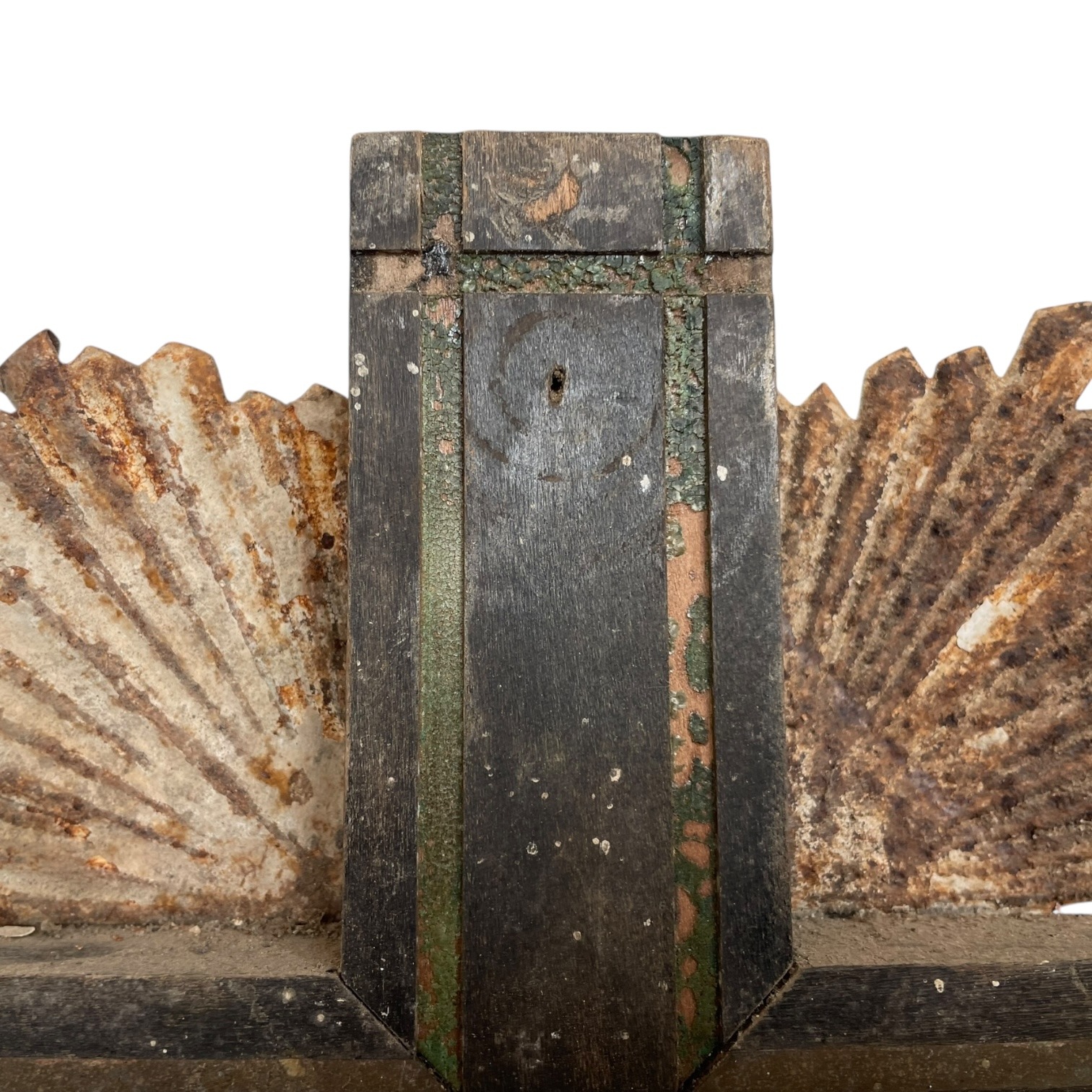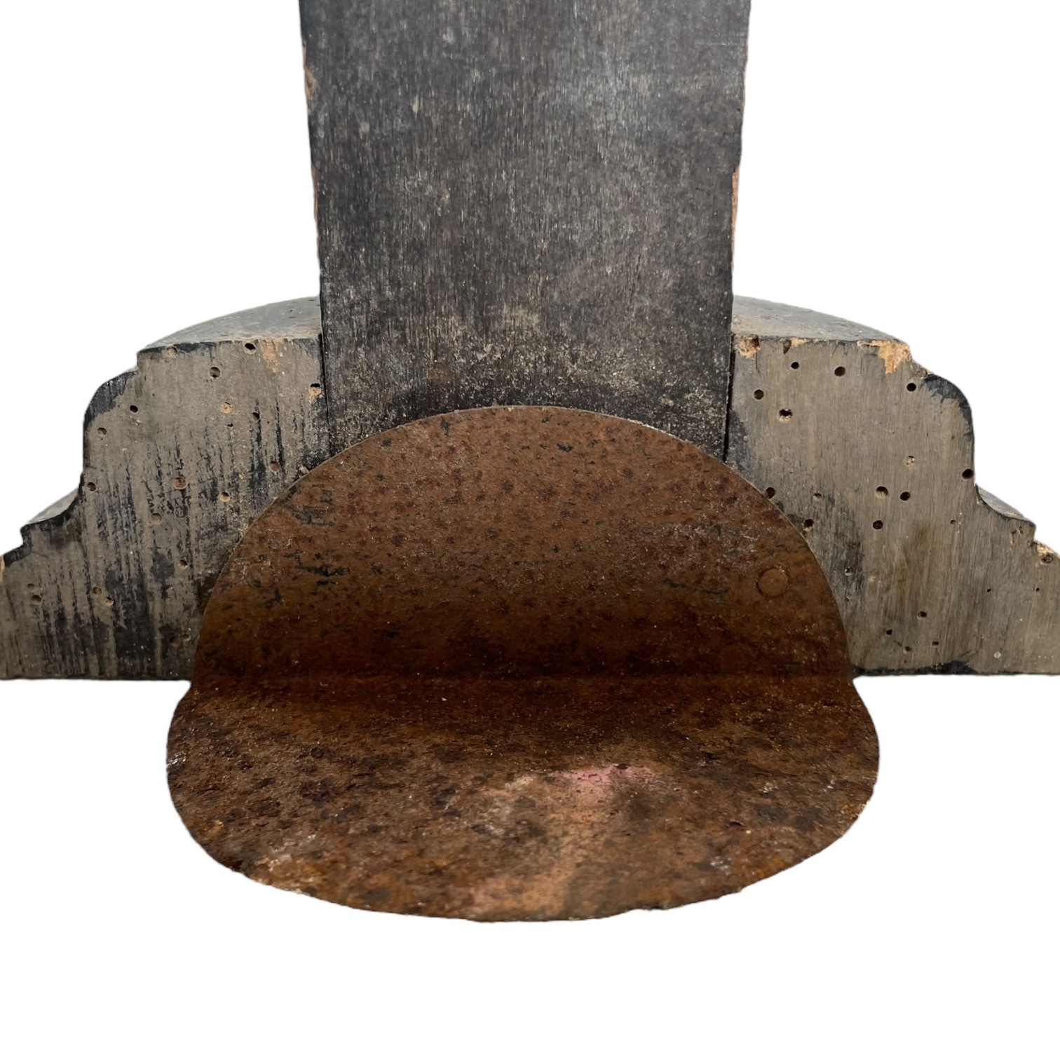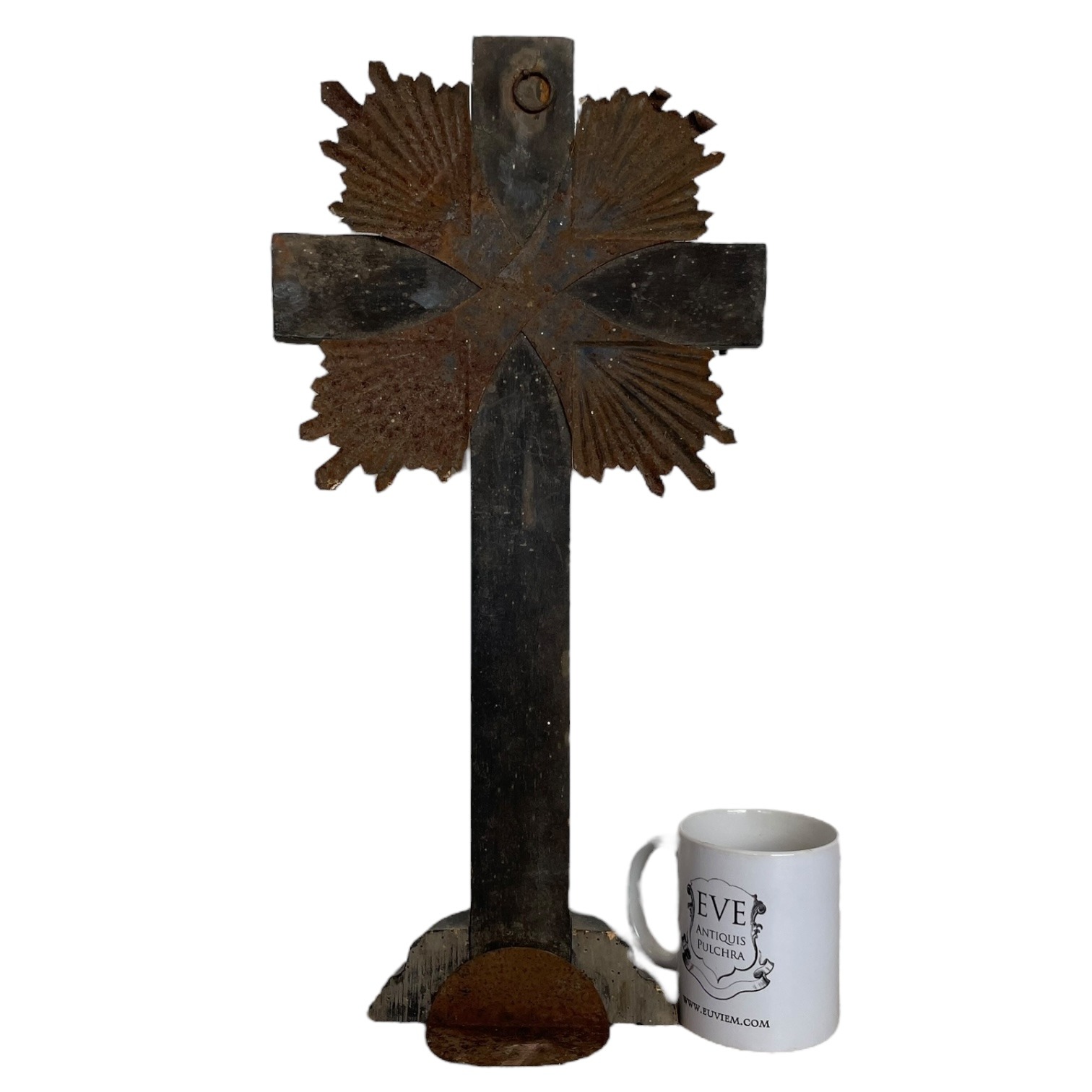 Condition: in vintage condition, signs of previous use and display, dusty, scratches and scrapes, bends (to the tops of the metal rays – we did not want to bend them back in case they break), surface rust, tarnish and patina to metalwork, inlaid metal work need sticking back in place and has some missing in multiple places, signs of long gone historical extensive woodworm to base – all treated just in case, please see all pictures