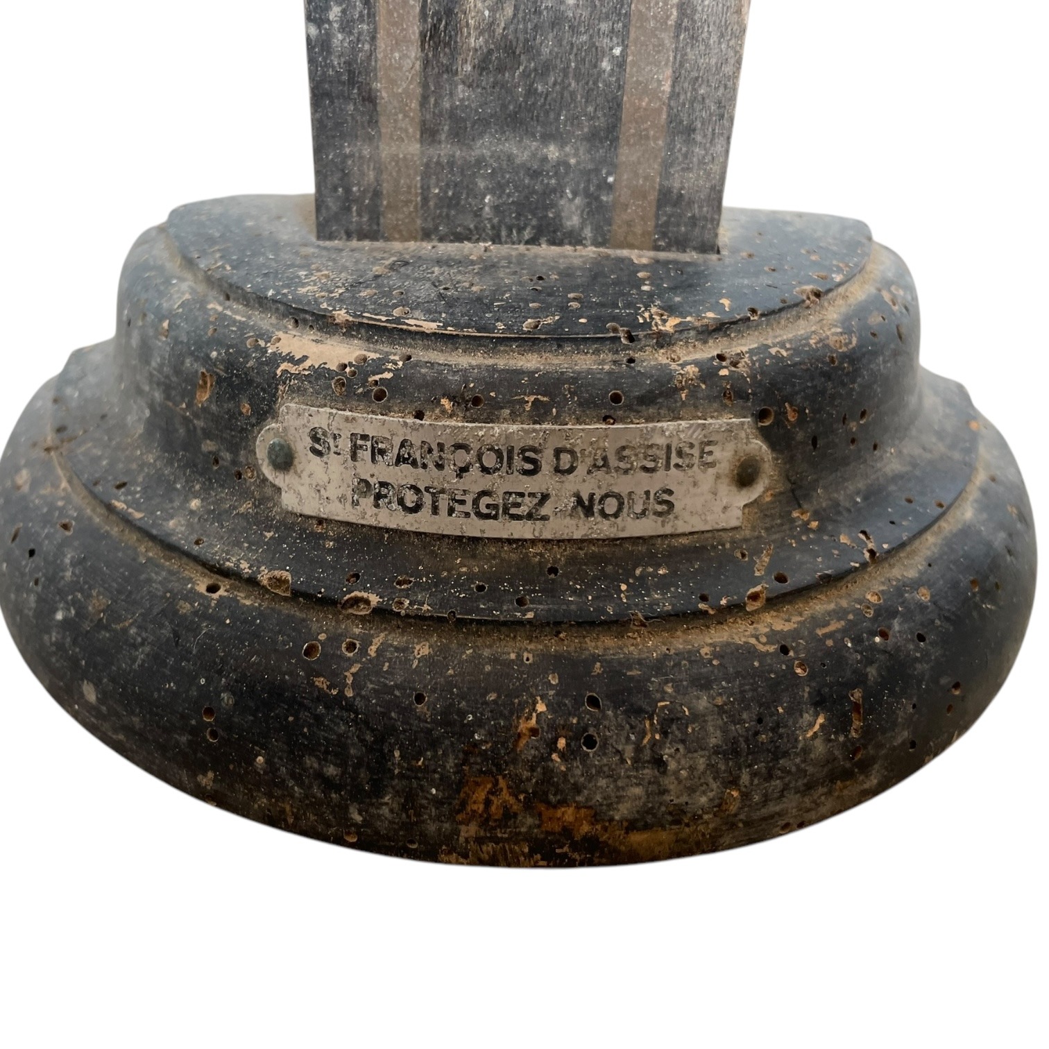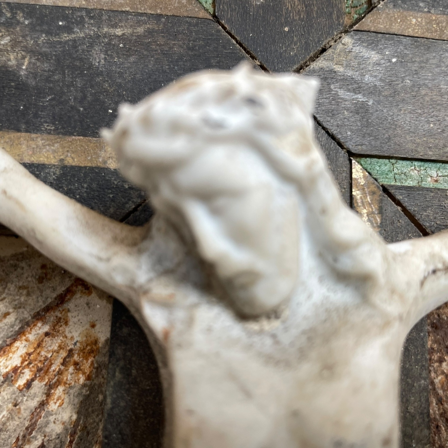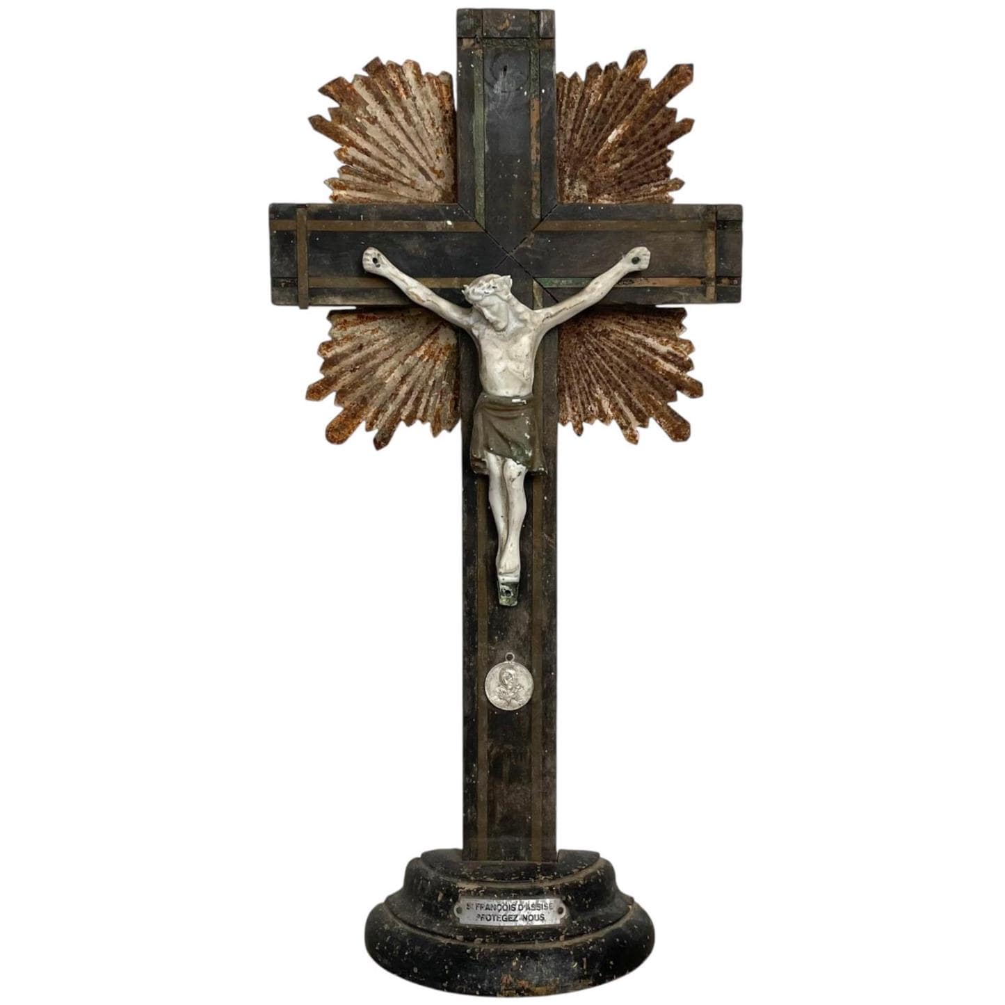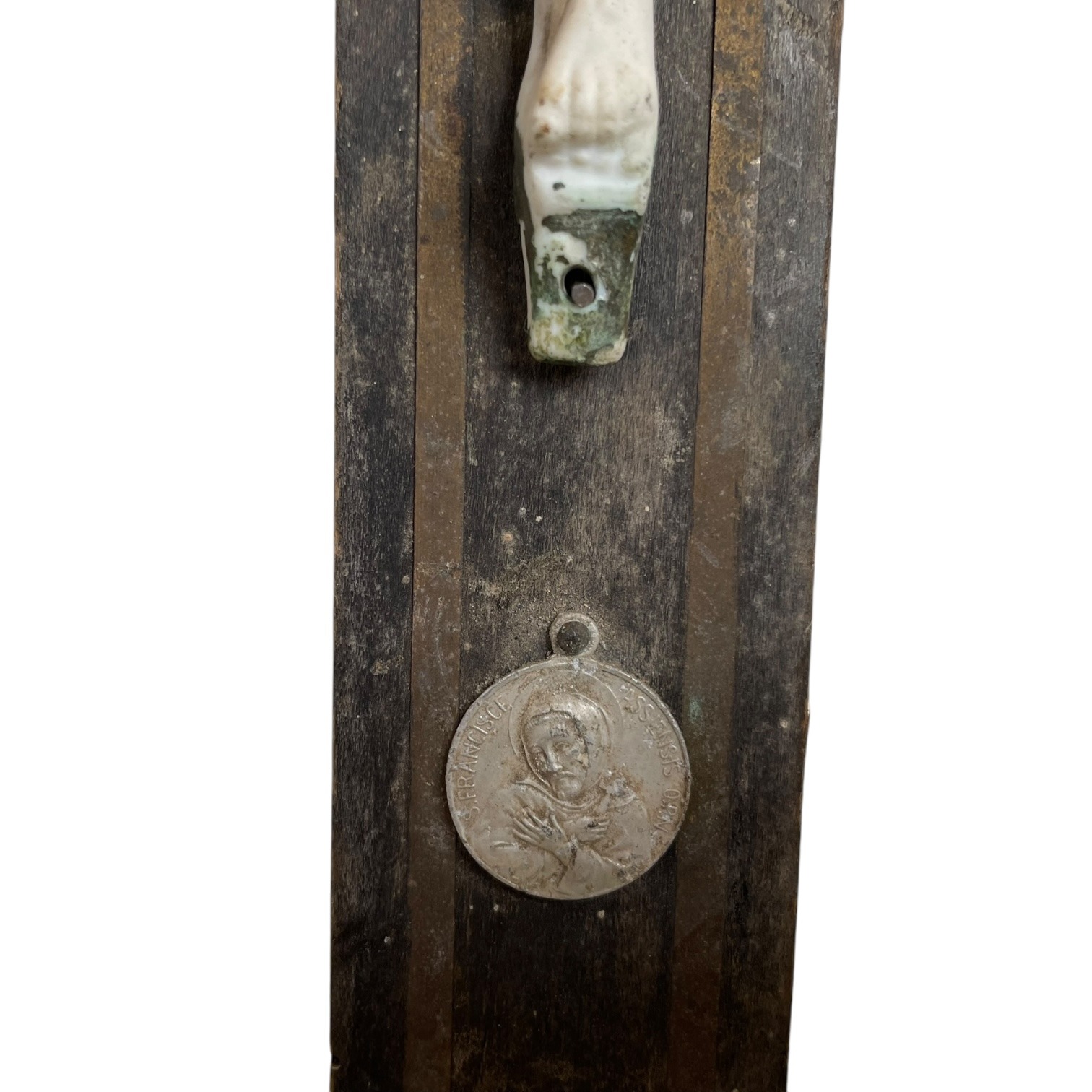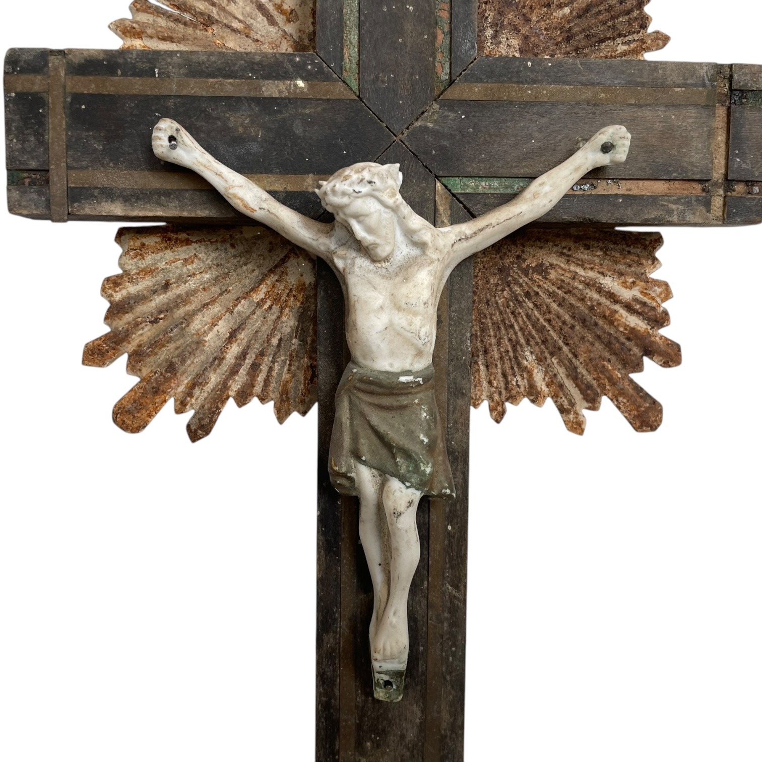 A vintage French wood, bisque and metal crucifix. Has some damage and signs of age as detailed below.
