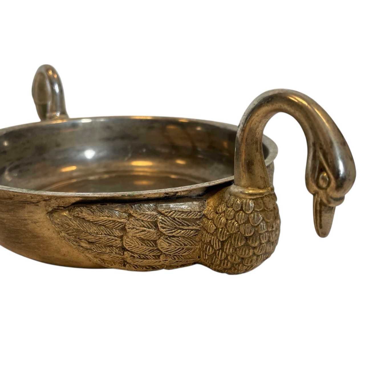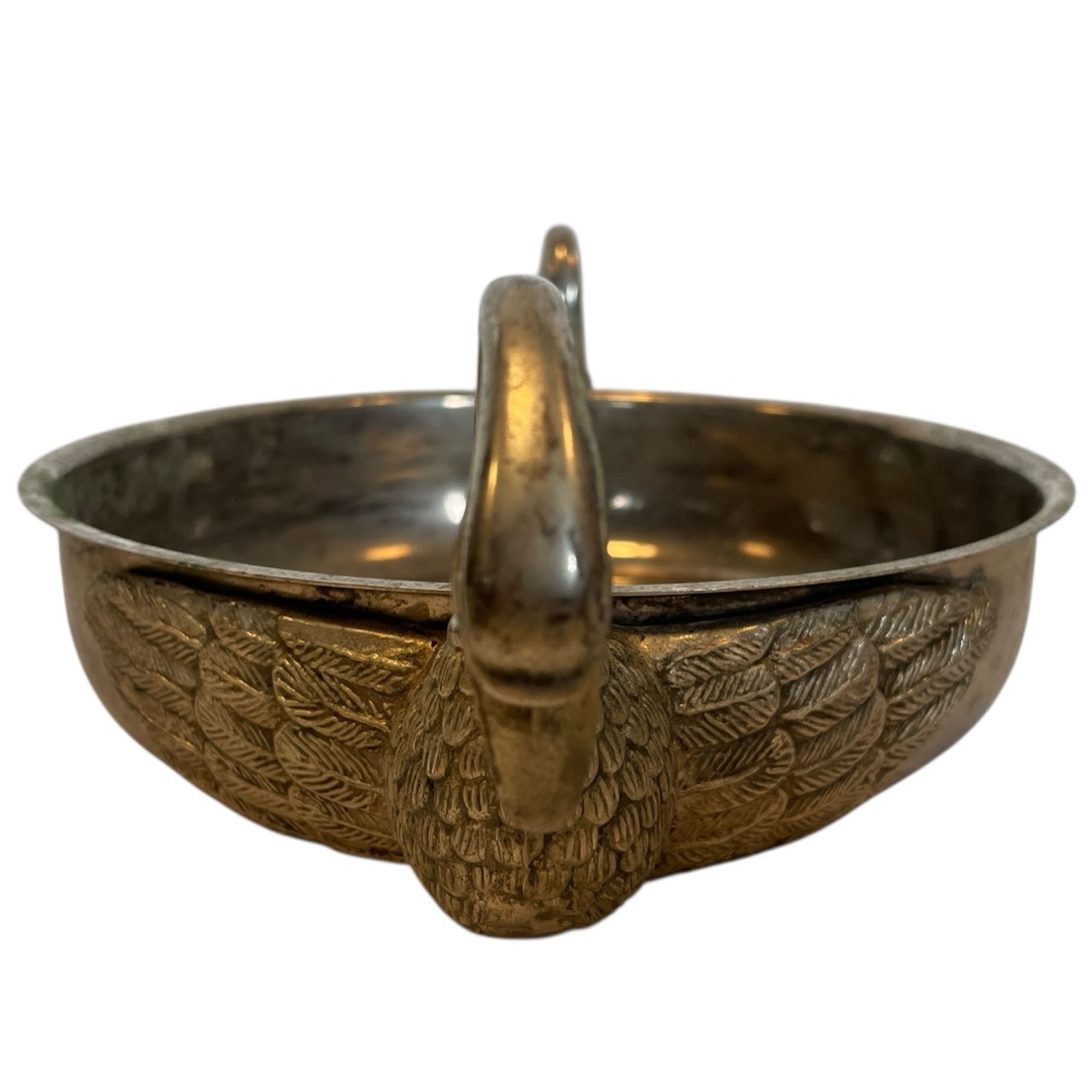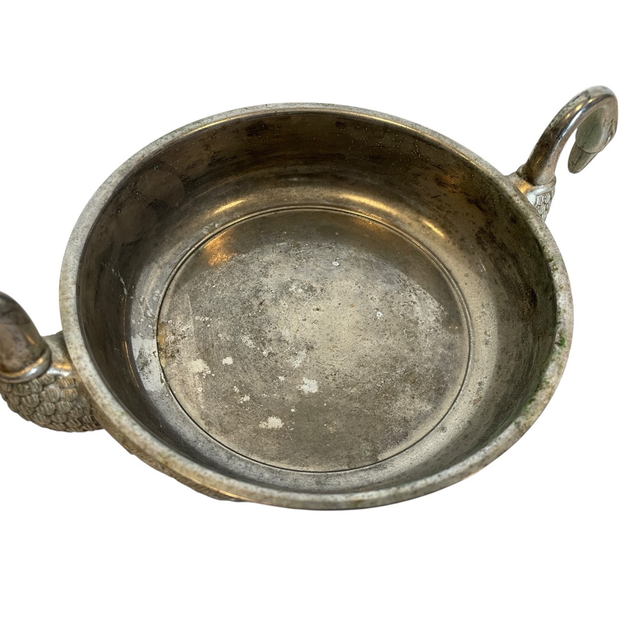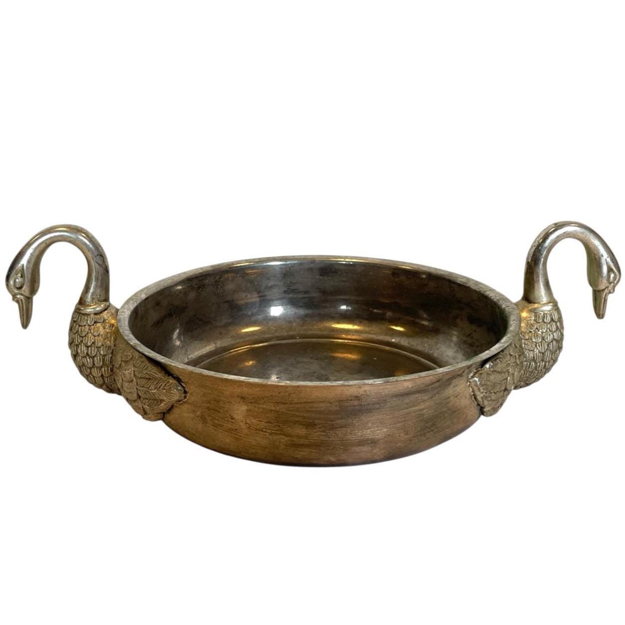 A vintage French metal bowl with swan head handles. Signs of age as detailed below.
