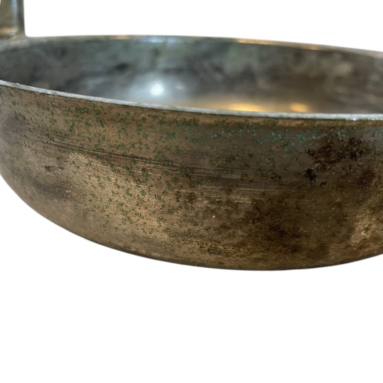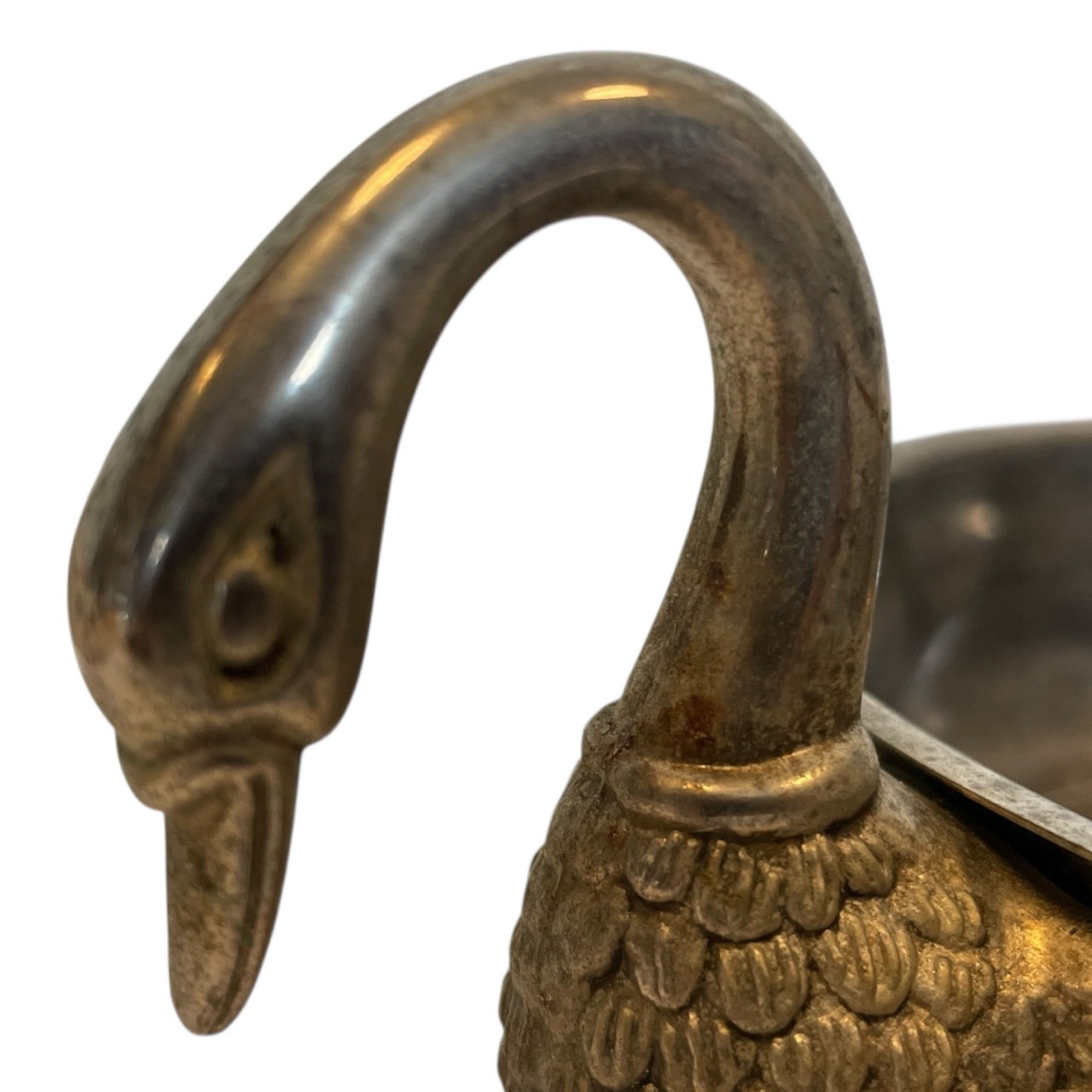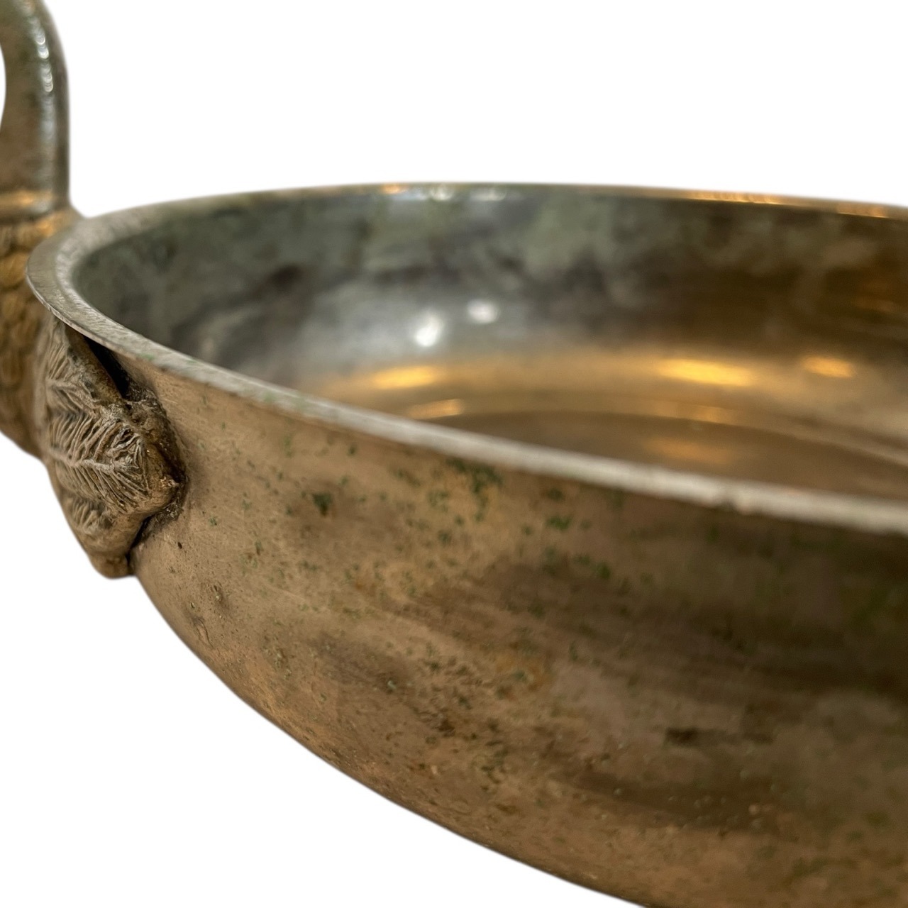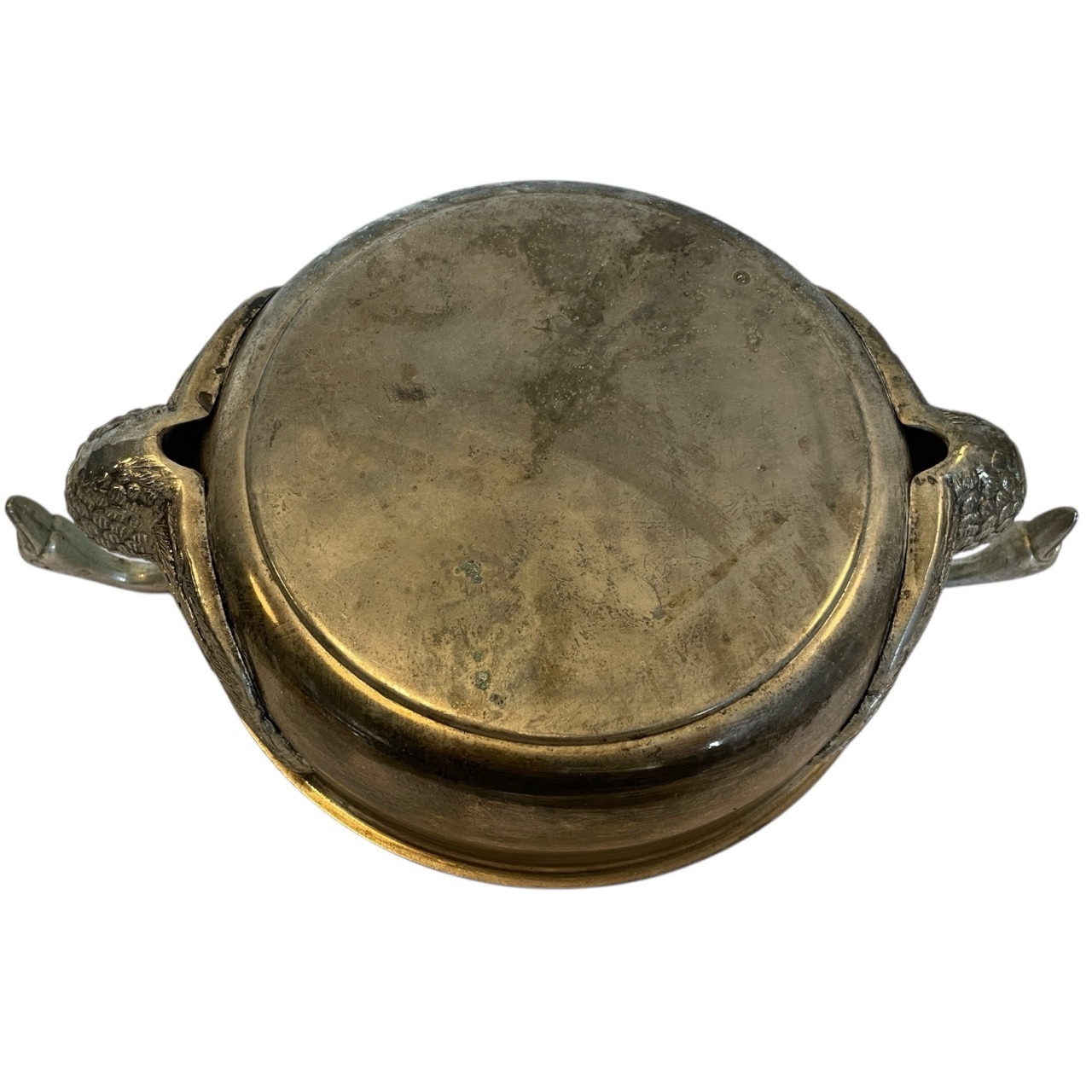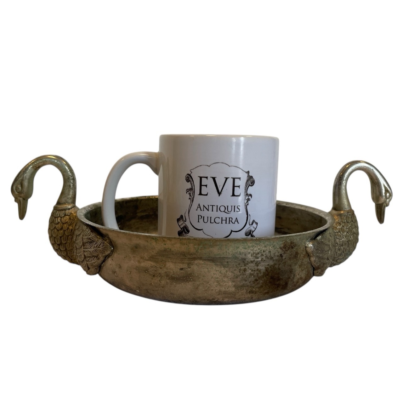 A vintage French metal bowl with swan head handles. Signs of age as detailed below.