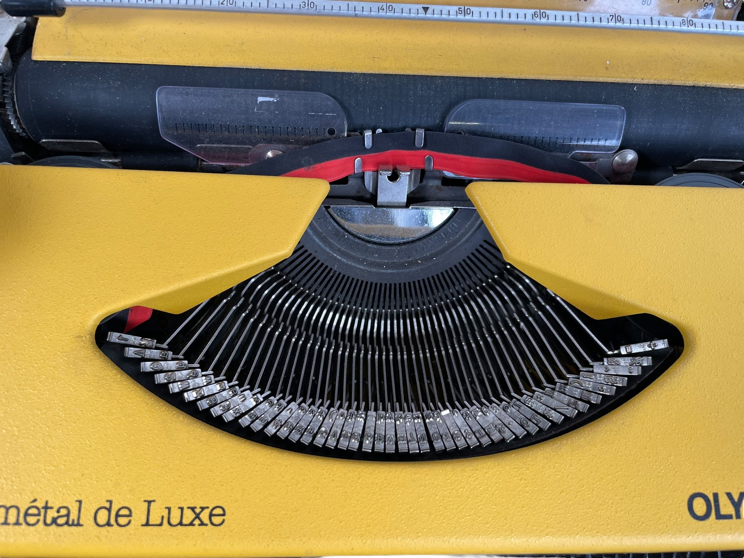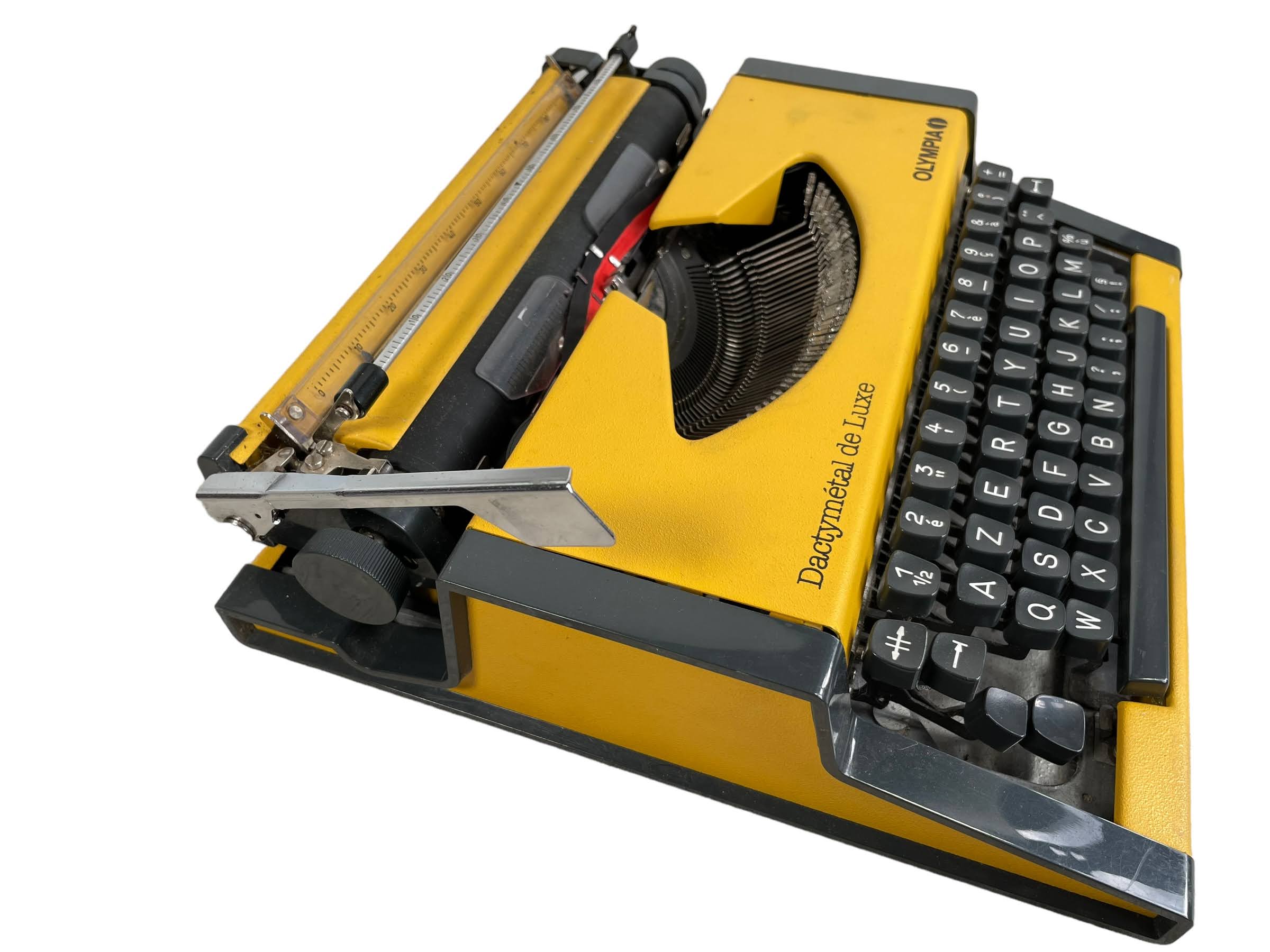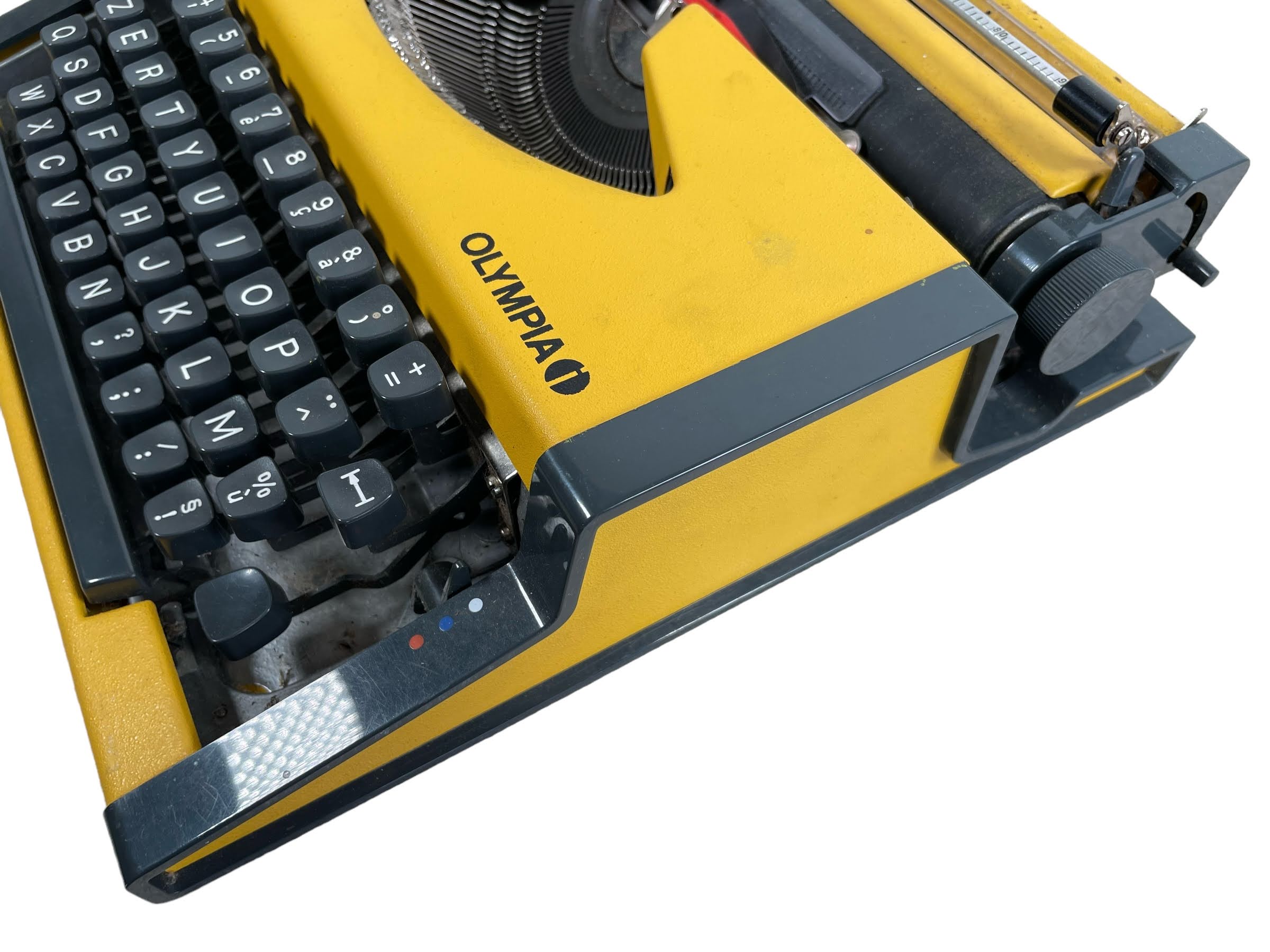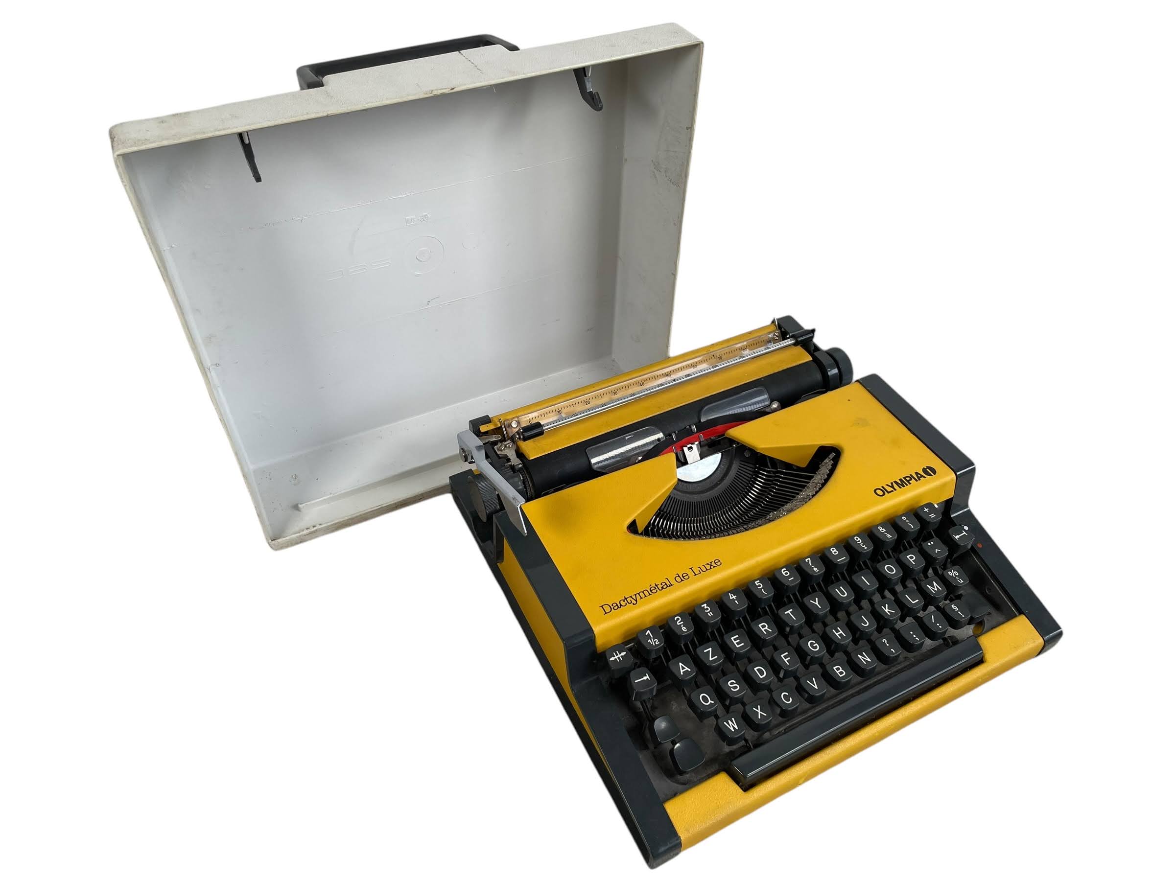 A vintage French Olympia typewriter. Made for the French market with the Azerty key layout. Something not working as it should, letter arms are moving well but ribbon is not raising as it should. Sold as prop/spares/repairs only. See further notes on condition below.