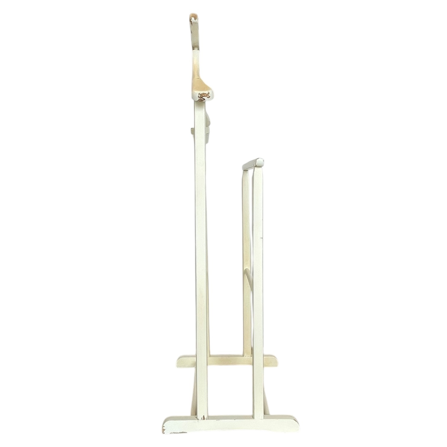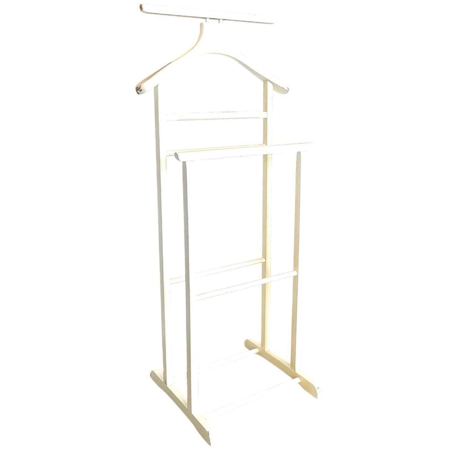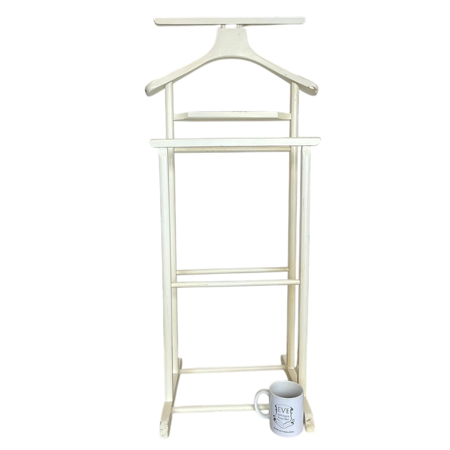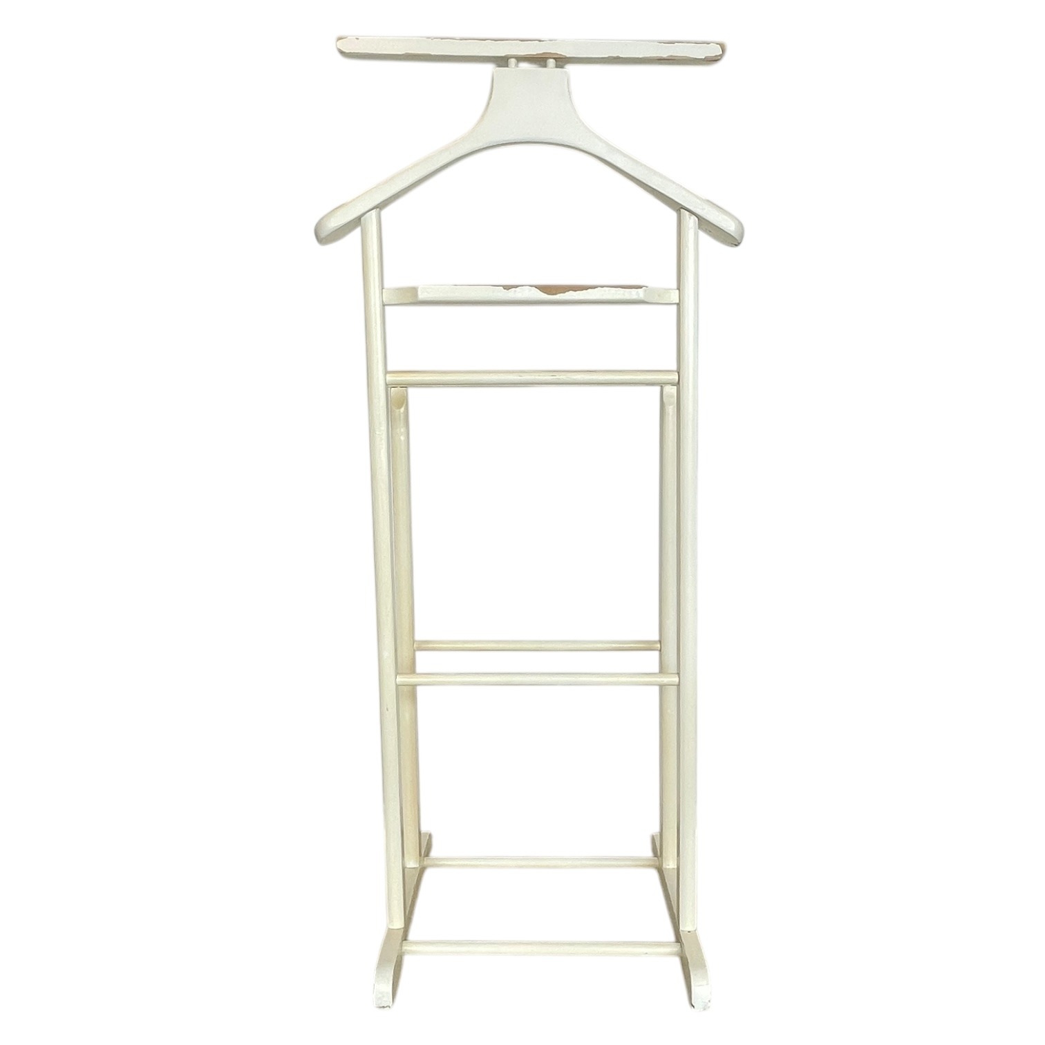 A Vintage Wooden Butler Valet Stand. This one has been painted over its original wood finish. This paint job is a little shabby chic and is now quite chippy. Despite the chippy paint it is strong and functional. This “dumb valet” clothing stand, or “Mr Jeeves” as they were commonly known, is handy for any bedroom, office or dressing room. Please see further notes on condition below.