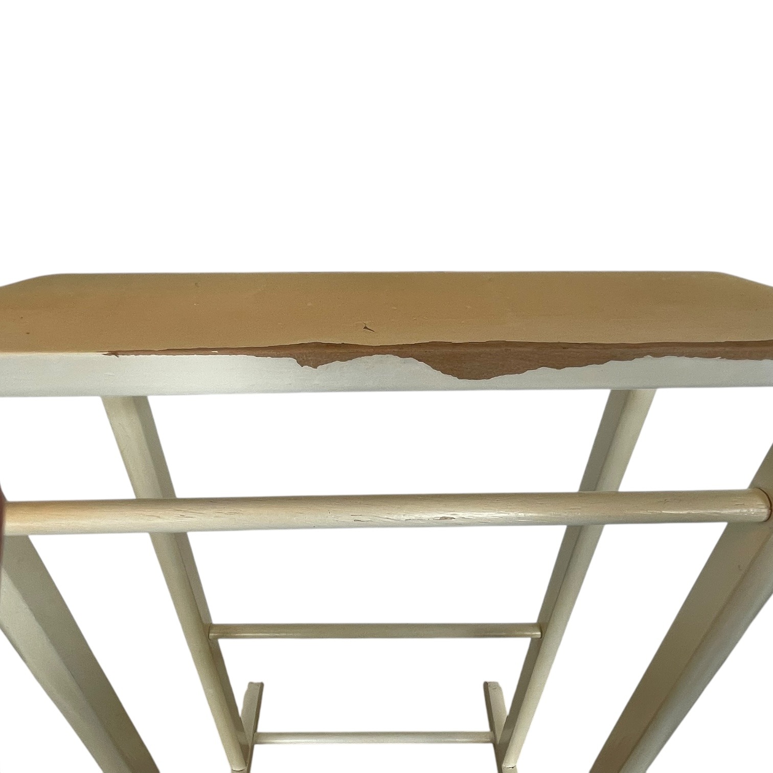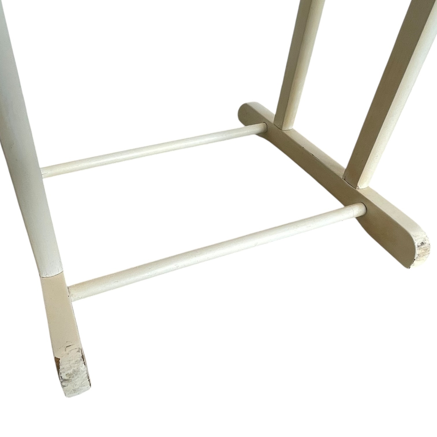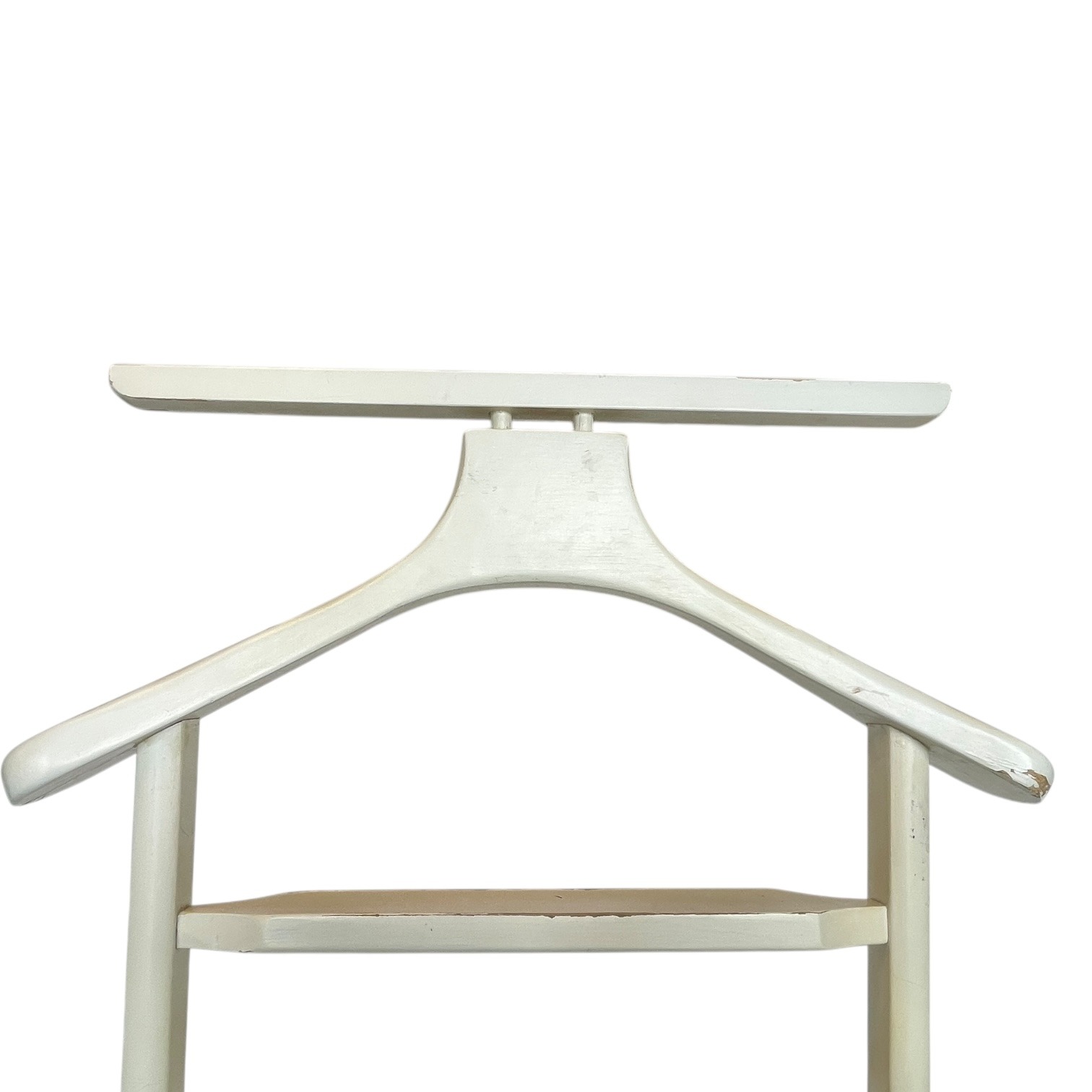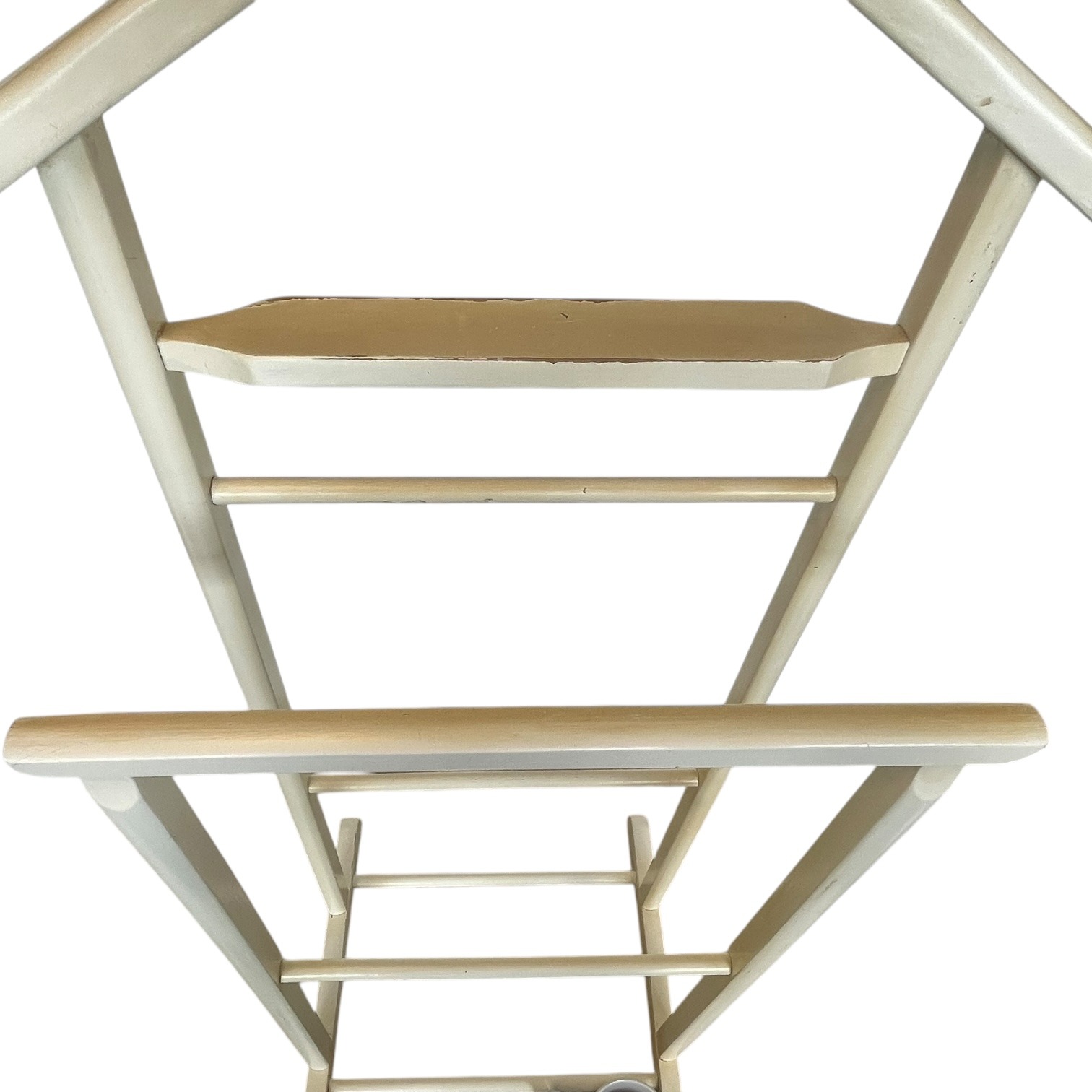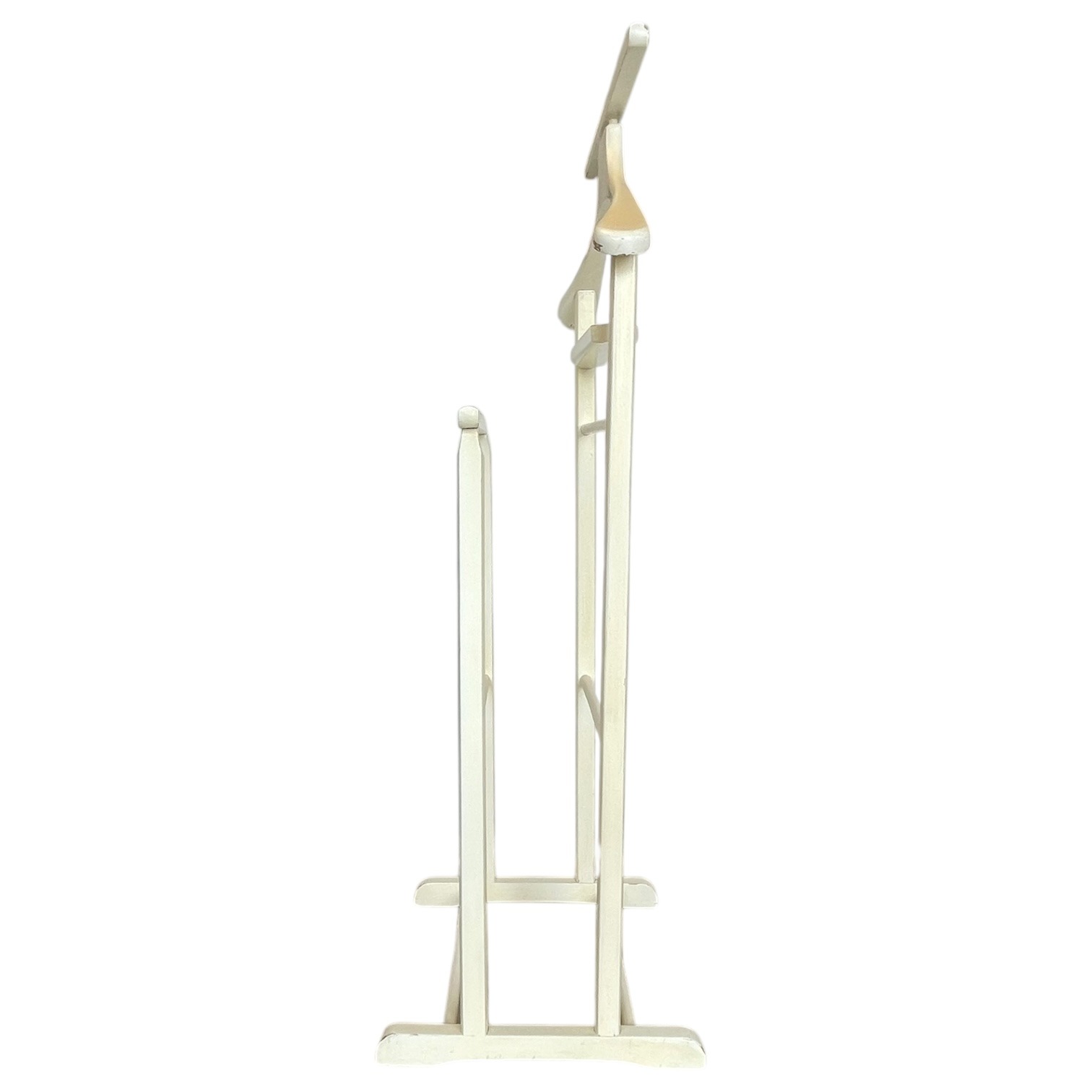 A Vintage Wooden Butler Valet Stand. This one has been painted over its original wood finish. This paint job is a little shabby chic and is now quite chippy. Despite the chippy paint it is strong and functional. This “dumb valet” clothing stand, or “Mr Jeeves” as they were commonly known, is handy for any bedroom, office or dressing room. Please see further notes on condition below.