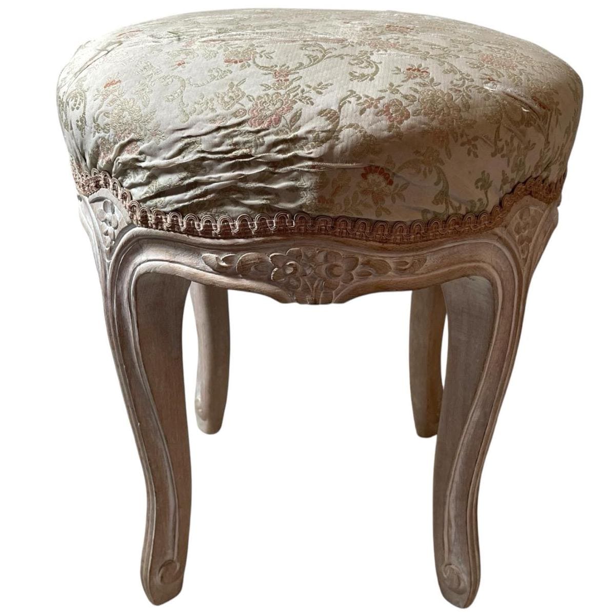 A vintage French wooden cushioned footstool. This one is in poor cosmetic condition given the wear to the seat fabric but good structural condition. Please see further notes on condition and important safety information below.