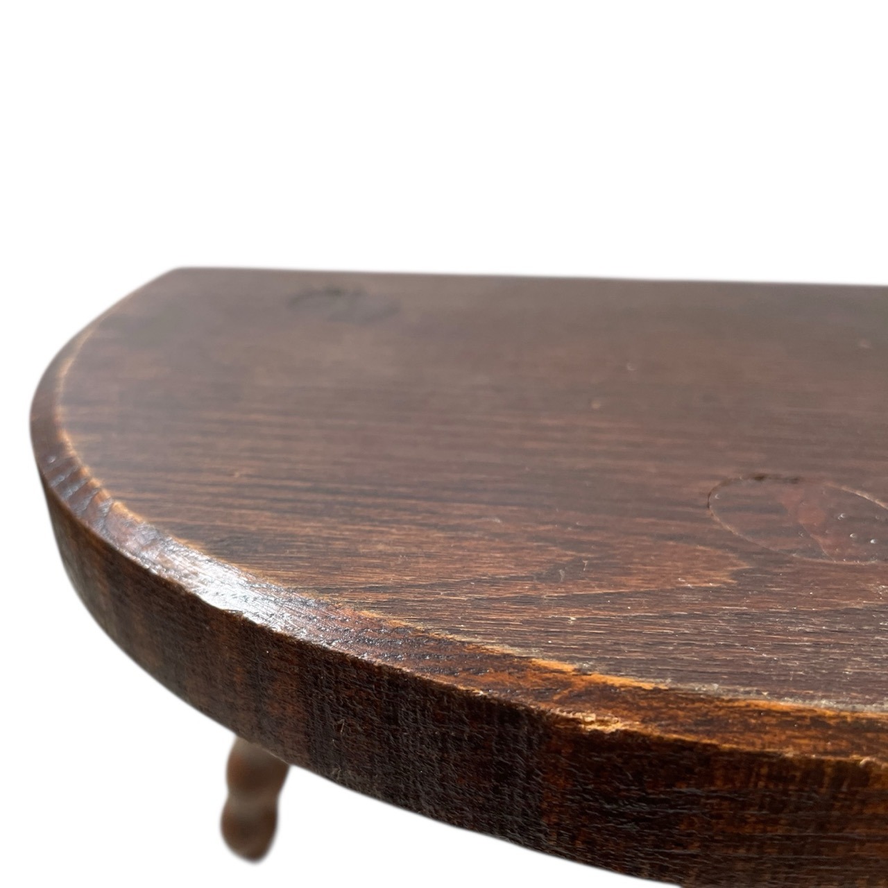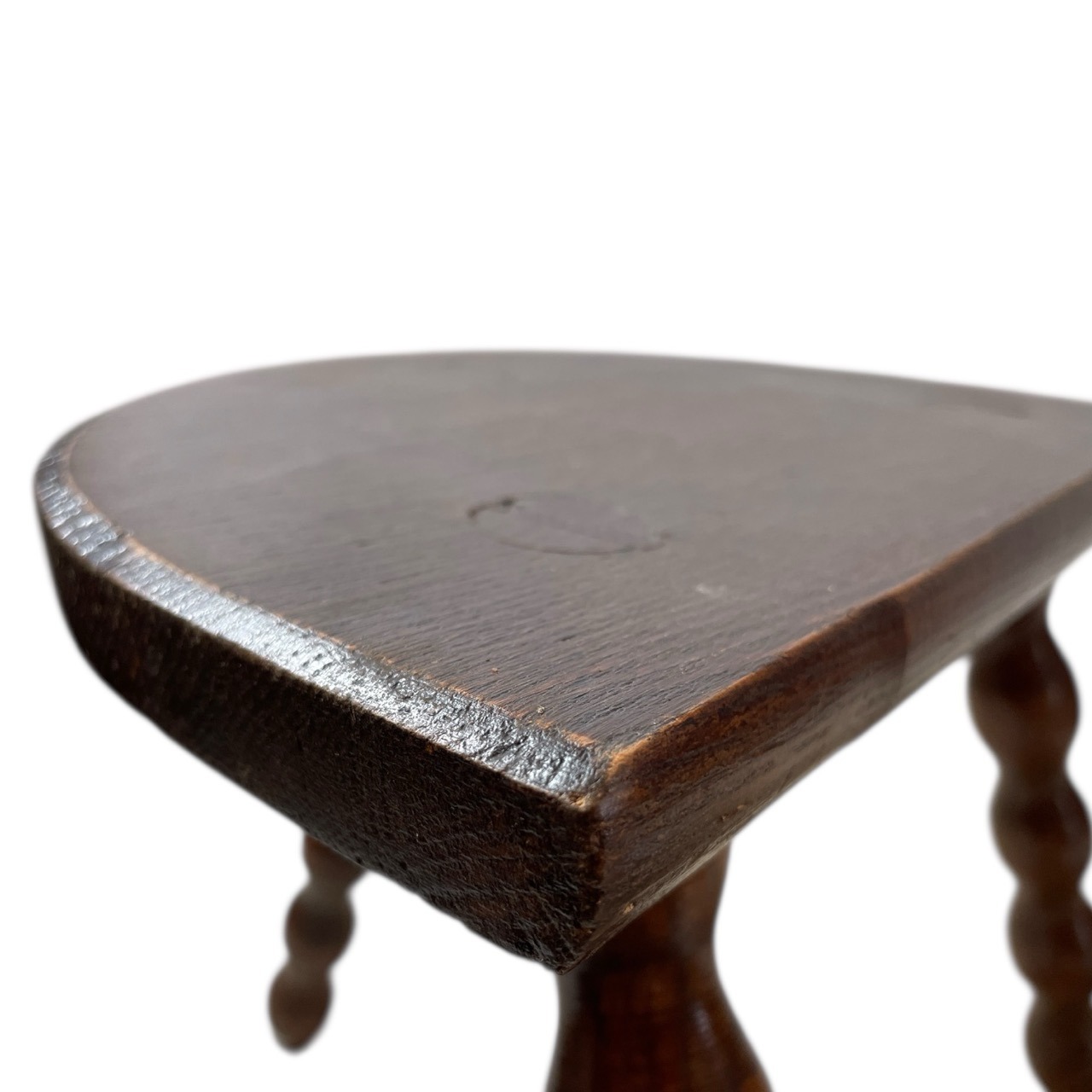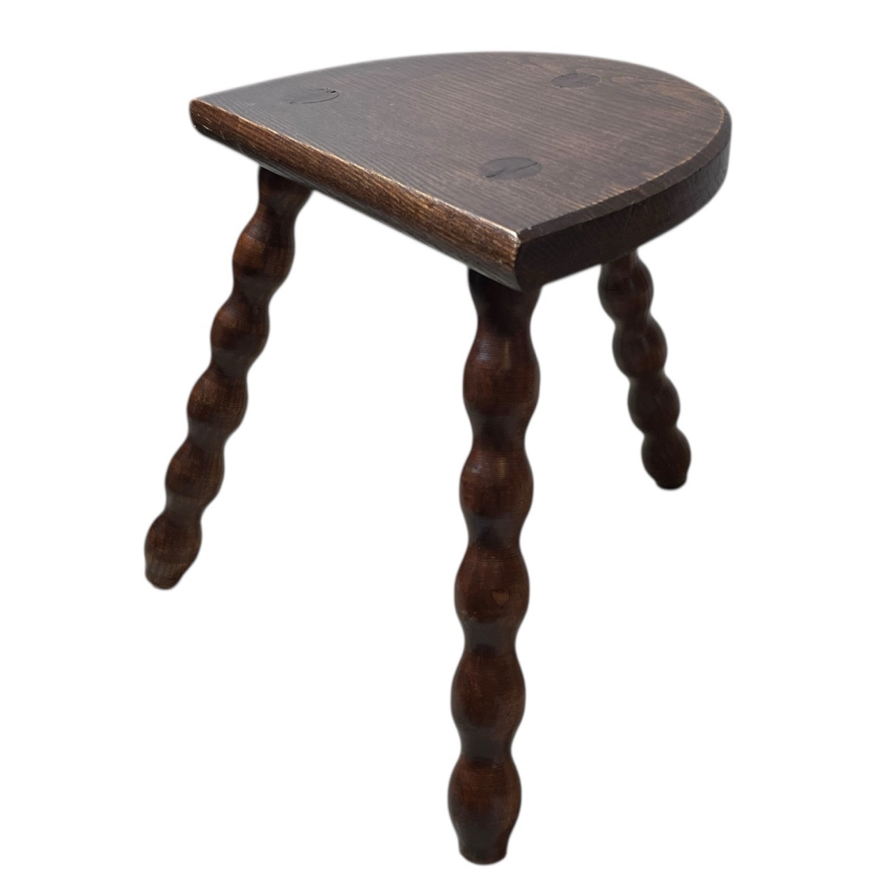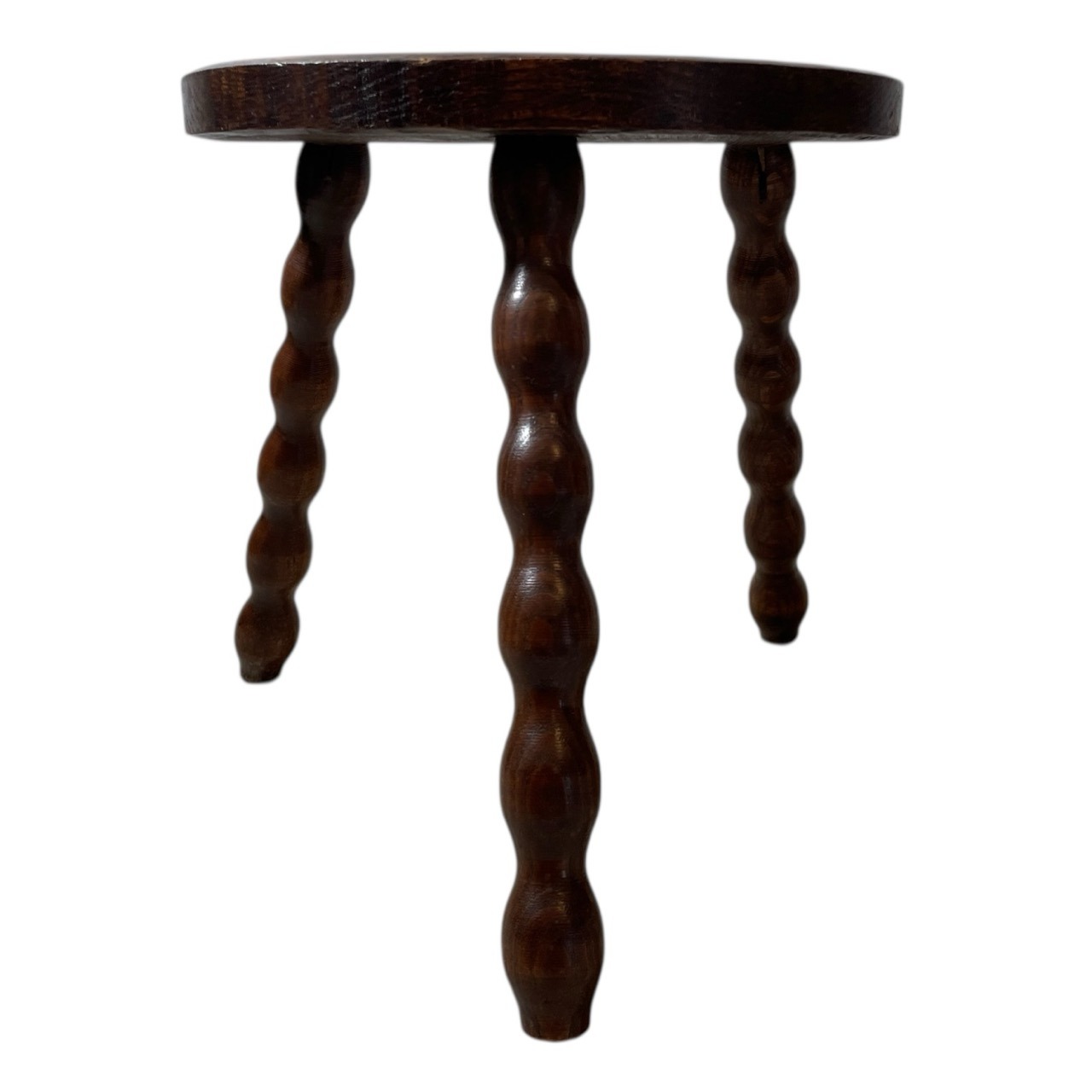 An always popular vintage French traditional wooden milking stool with bobbin style legs. A great pot stand for a rustic location or as a stool. This one is in good cosmetic condition and good structural condition with some signs of age as detailed below.