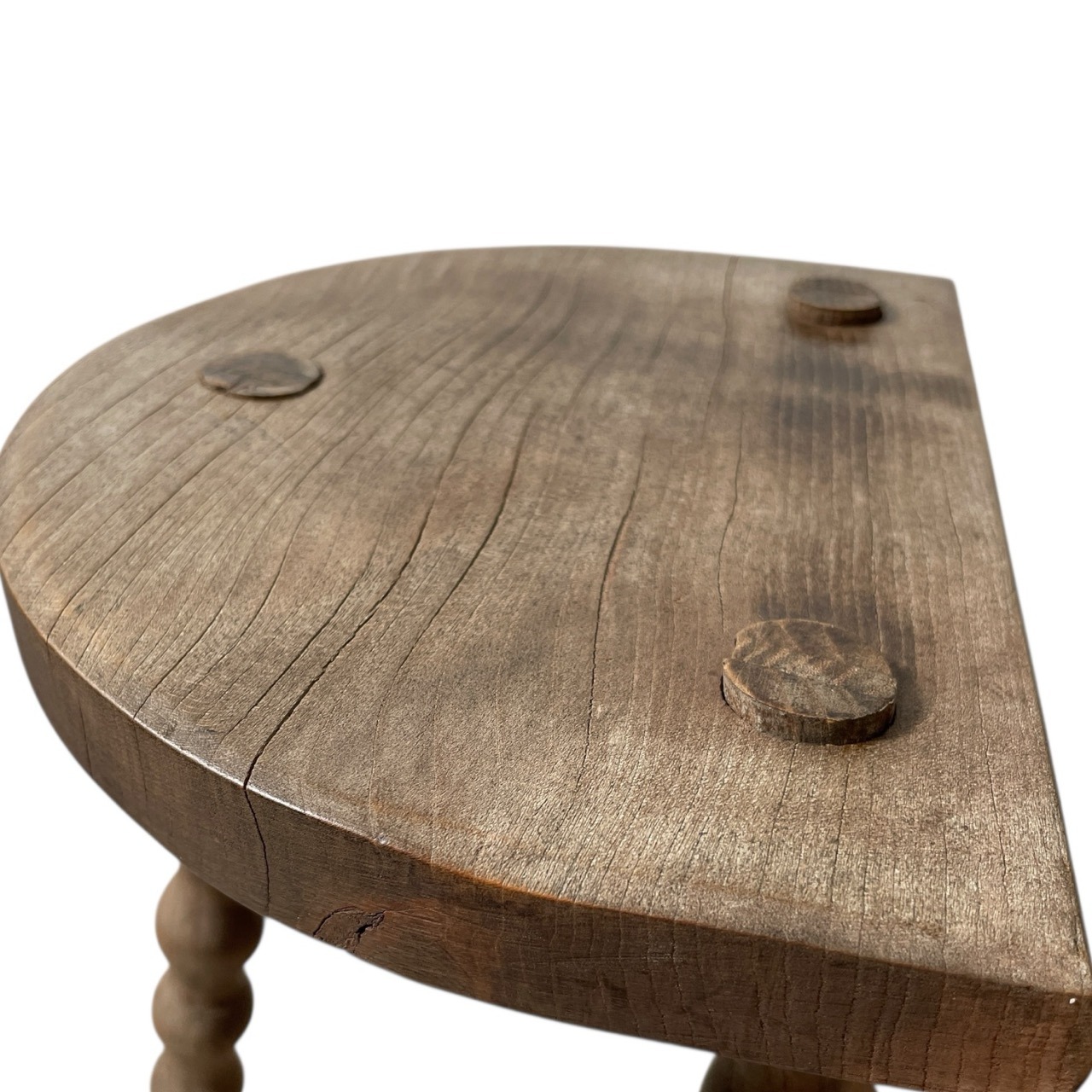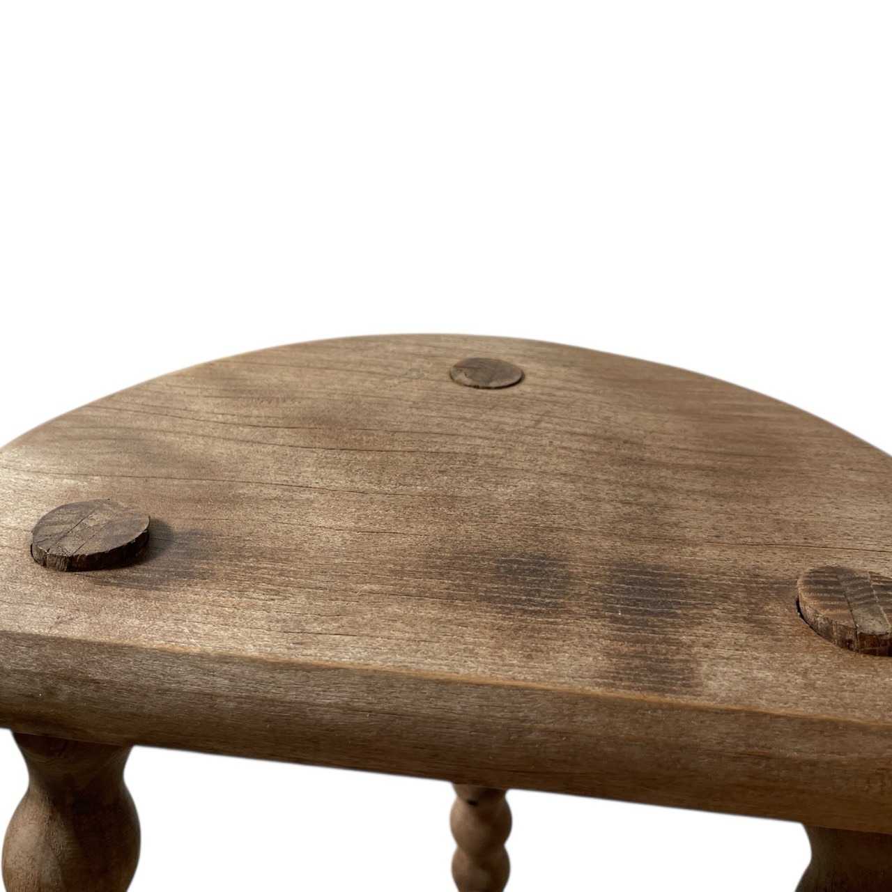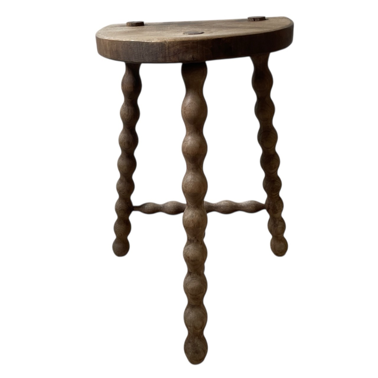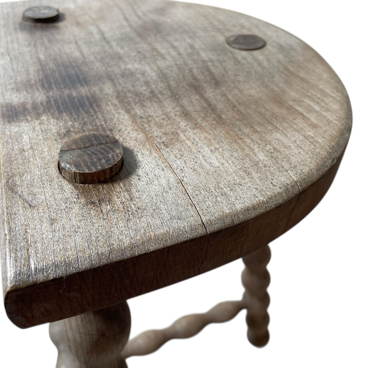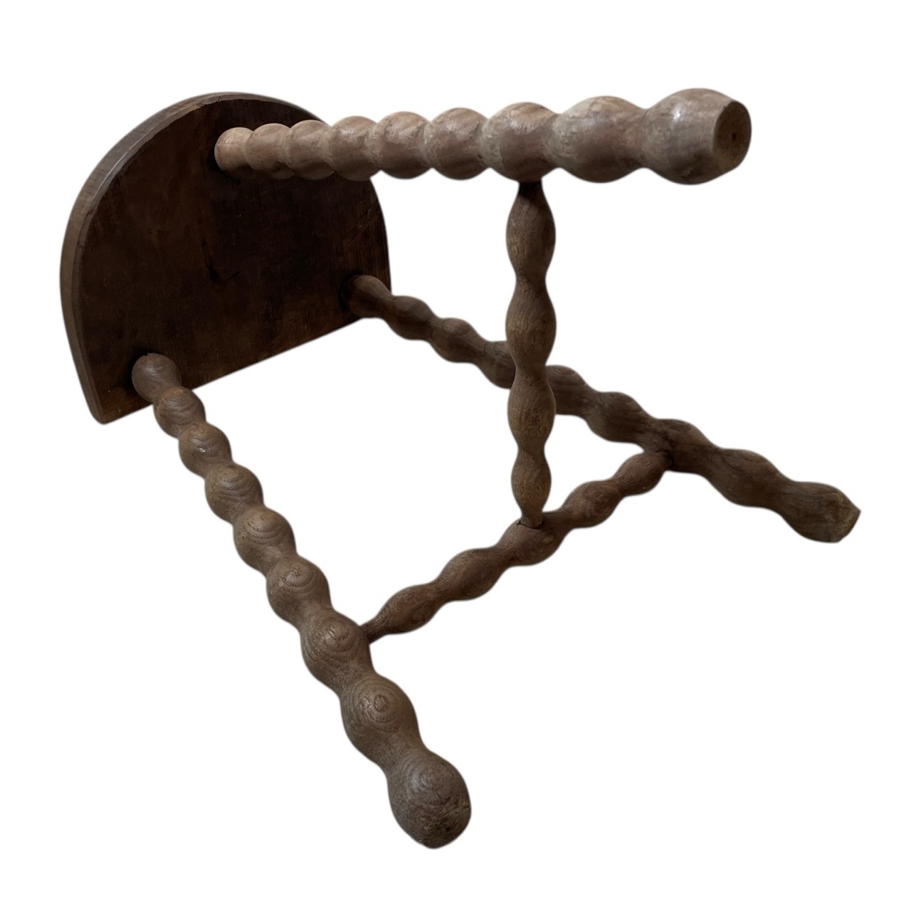 An always popular vintage French traditional wooden milking stool with bobbin style braced legs. We call these DT stools; D for the seat and T for the brace. A great pot stand for a rustic location or as a stool. This one is in fair structural condition and fair cosmetic condition. Some signs of age as detailed below. Ready for light work.