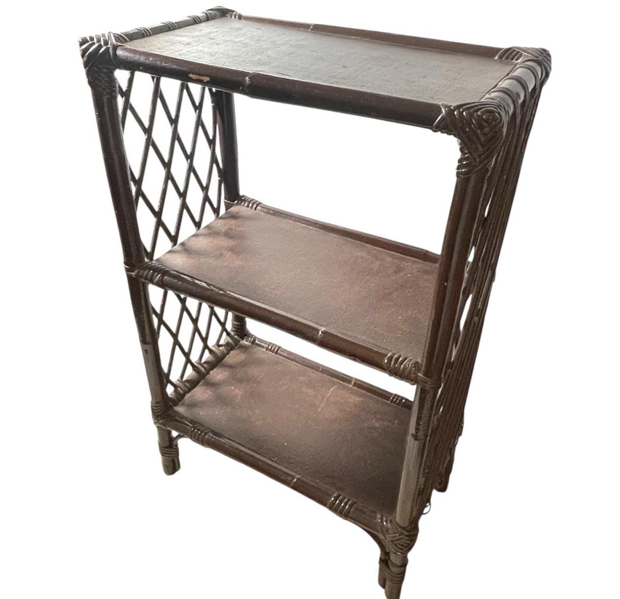 A vintage French small wood pole triple shelf unit. This one is in fair cosmetic condition and good structural condition. We suspect the shelfs have been replace at some point. Please see further notes on condition and important safety information below.