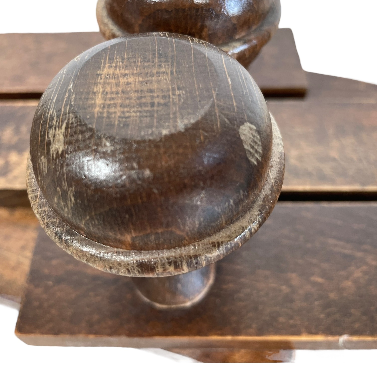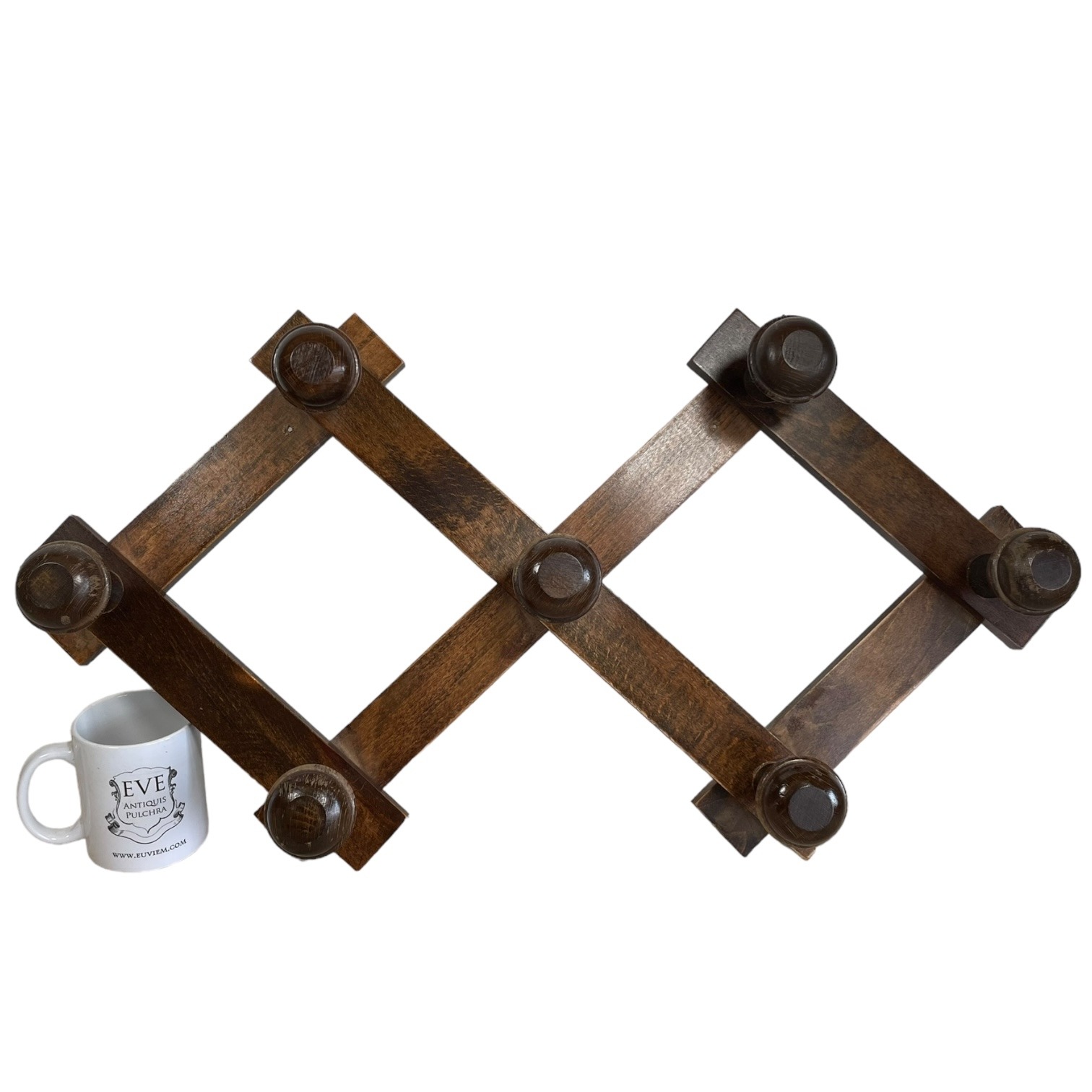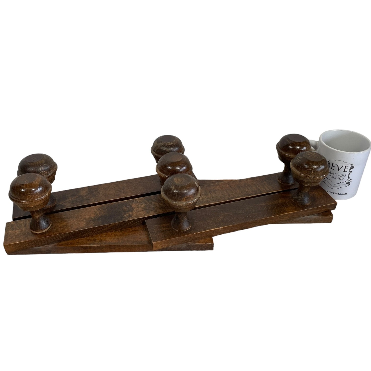 This listing is for a vintage French wooden coat rack with seven round knobs. Adjustable and foldable. Signs of age as detailed below.