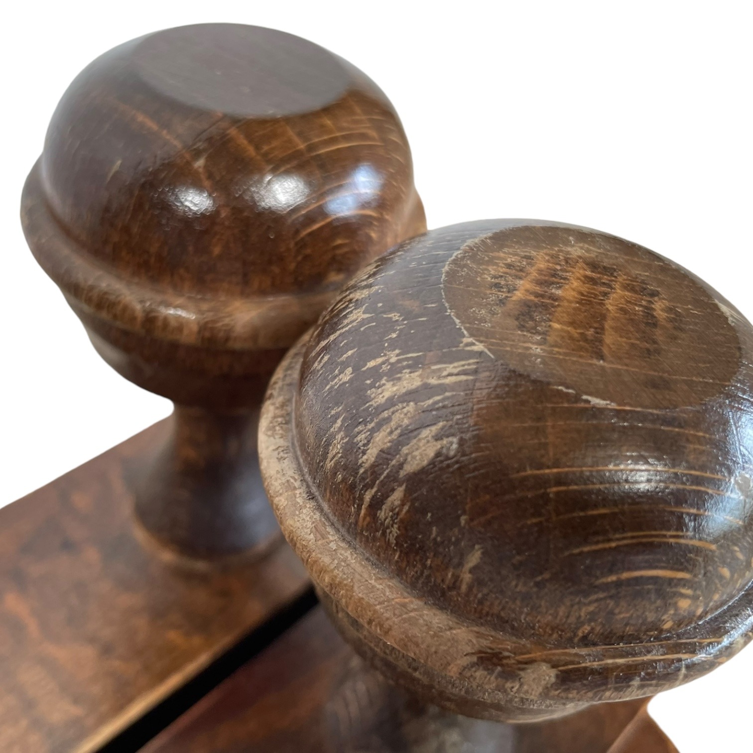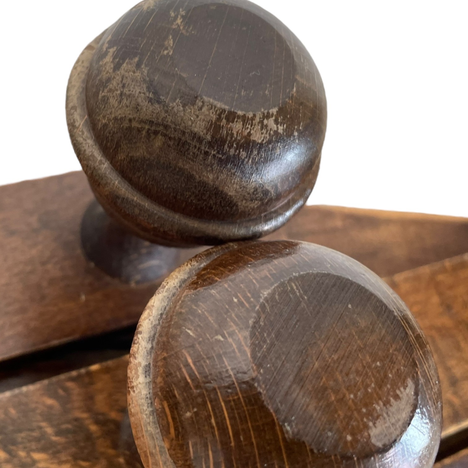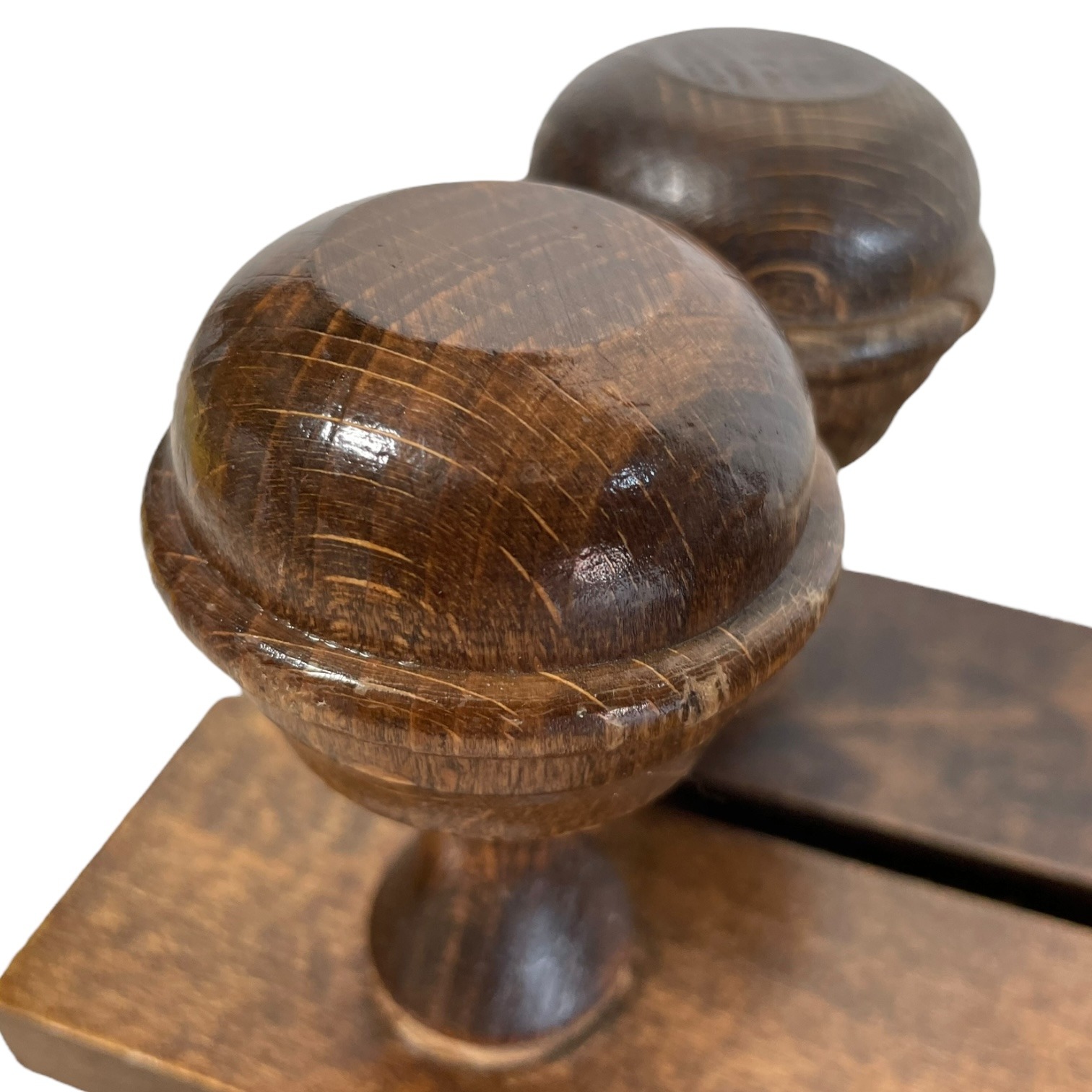 Condition: in vintage condition with signs of previous use, some wear, dings and marks, varnish worn especially on knobs, a functional piece, previously fixed to wall with two screws not supplied, please see all pictures