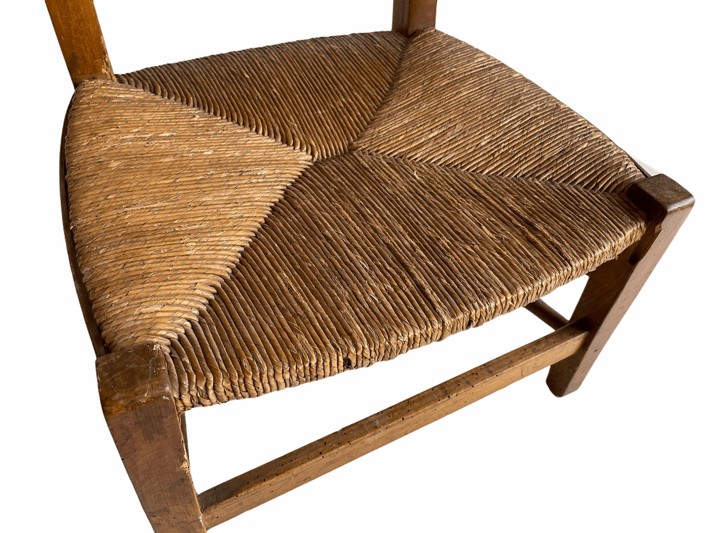Condition: in vintage condition with signs of previous use, wear and scrapes, tarnish and patina, wear to raffia, heavy traces of woodworm damage, wooden covering bar on seat front missing, large crack on arm rest and some scribbles, suggest lighter use only but still structurally sound which makes a change for these. Please see all photos.