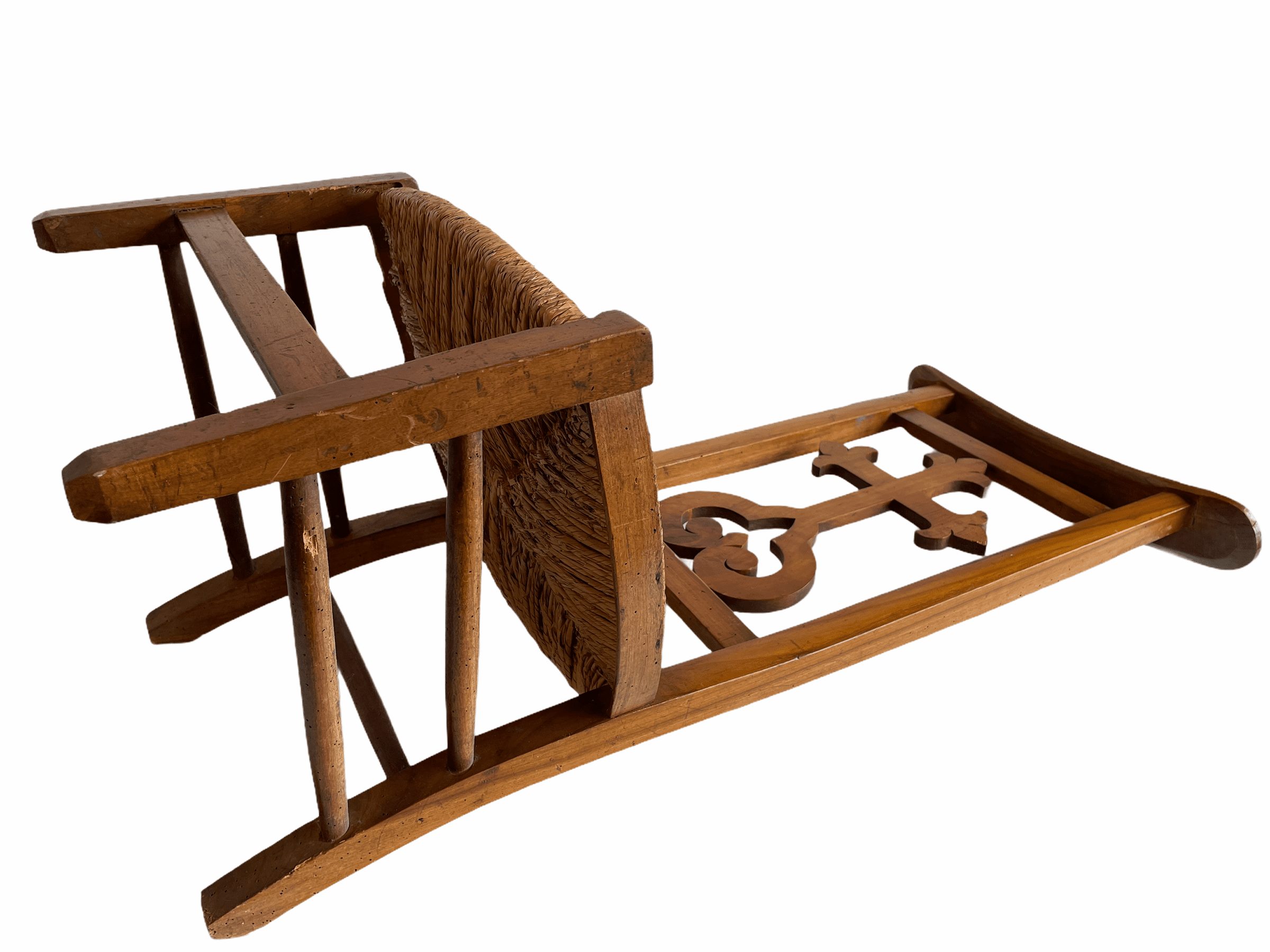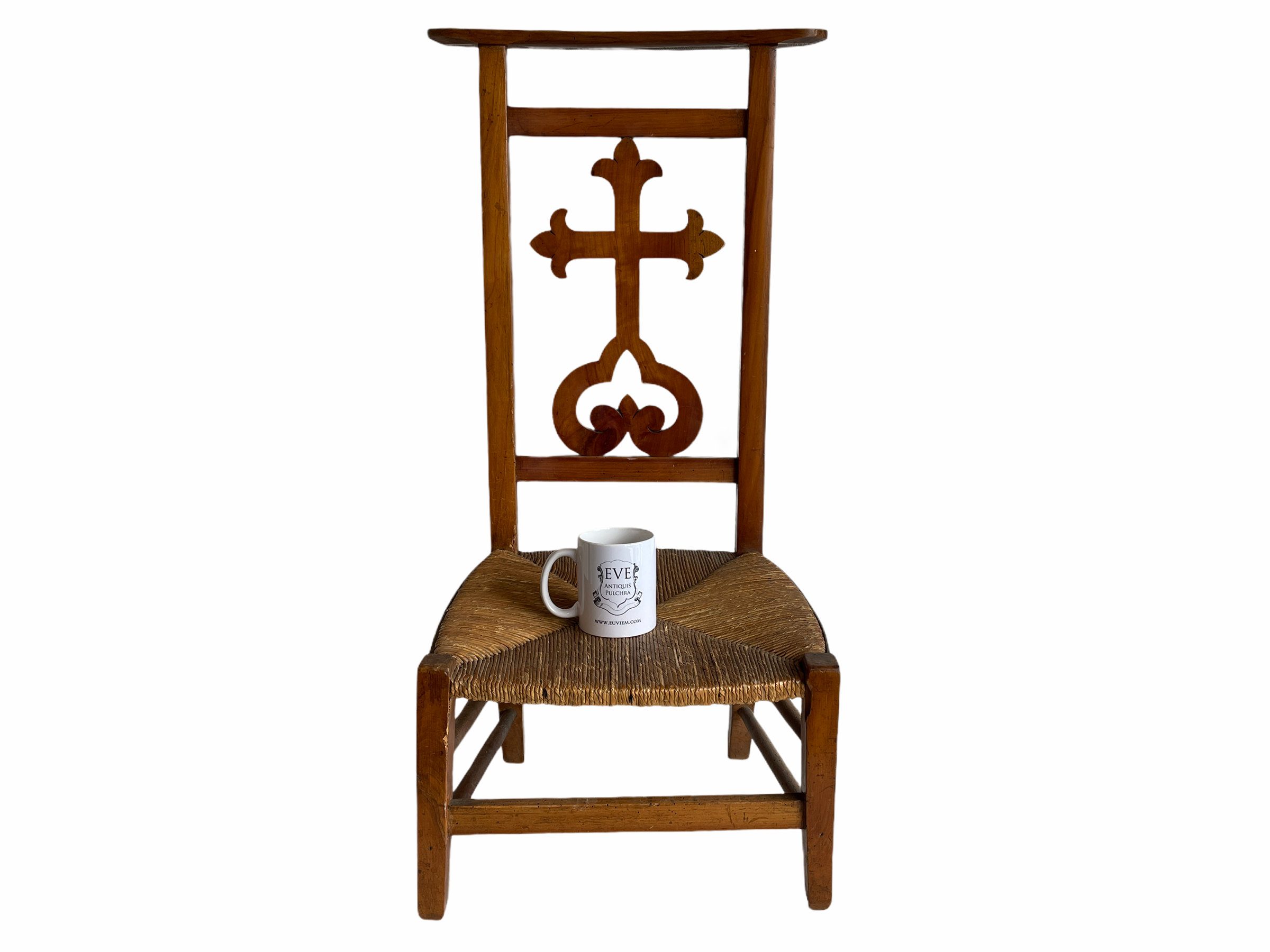 A vintage French prayer chair for kneeling on and praying, likely with a cushion added. Some wear to woven seat and signs of previous use but still strong and functional.