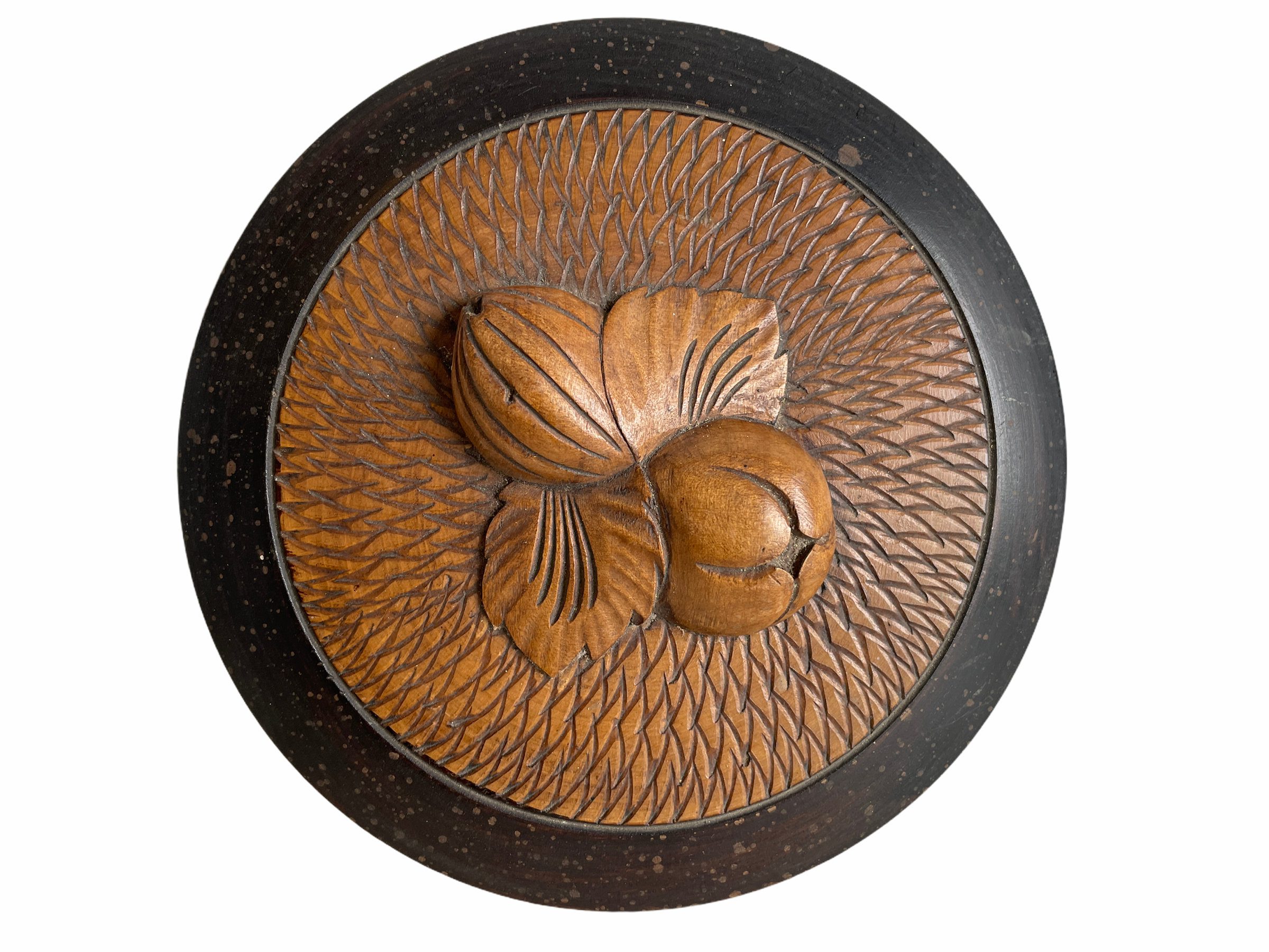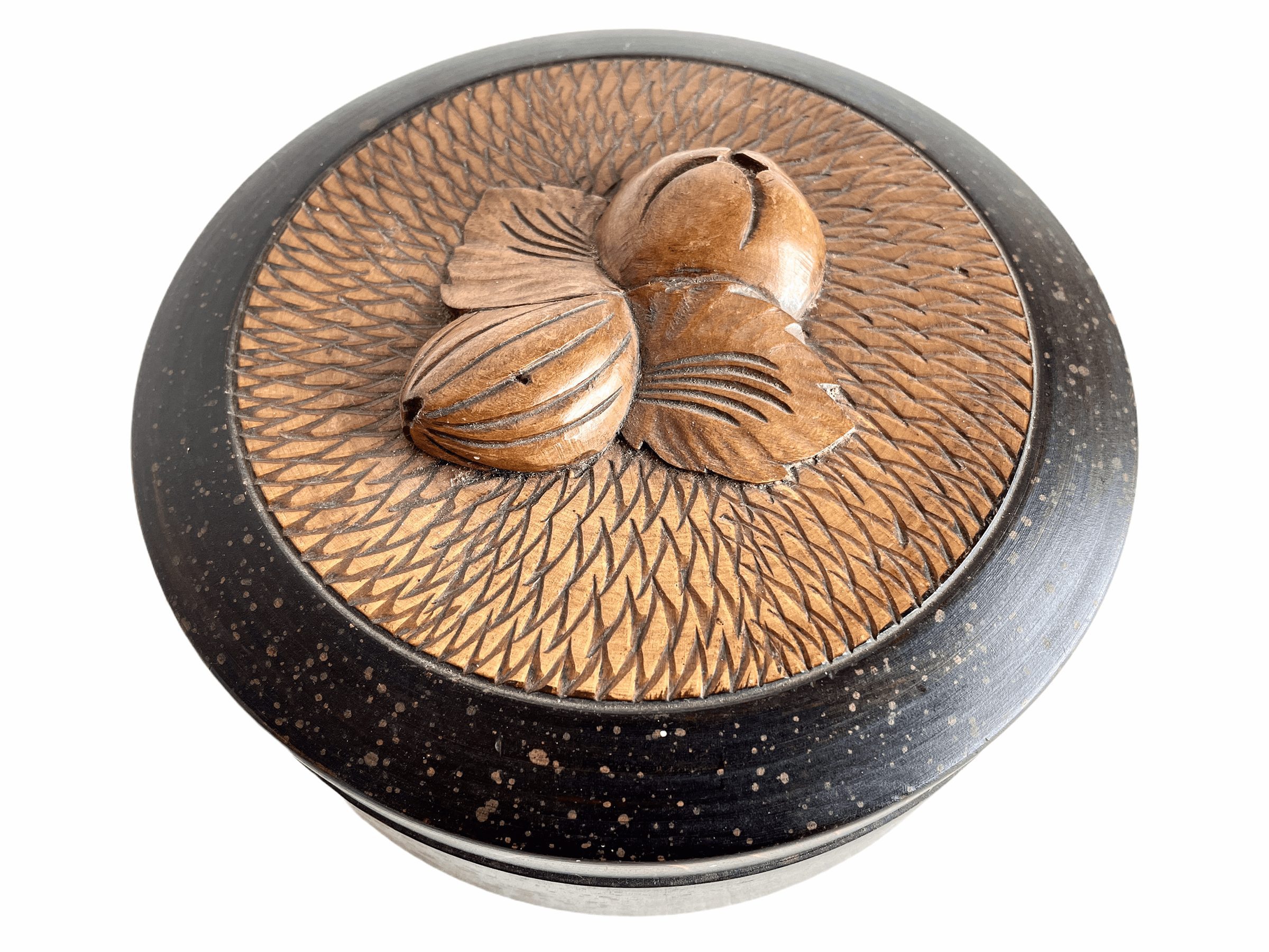 A vintage French ornately decorated wooden box. Carved nuts to top.