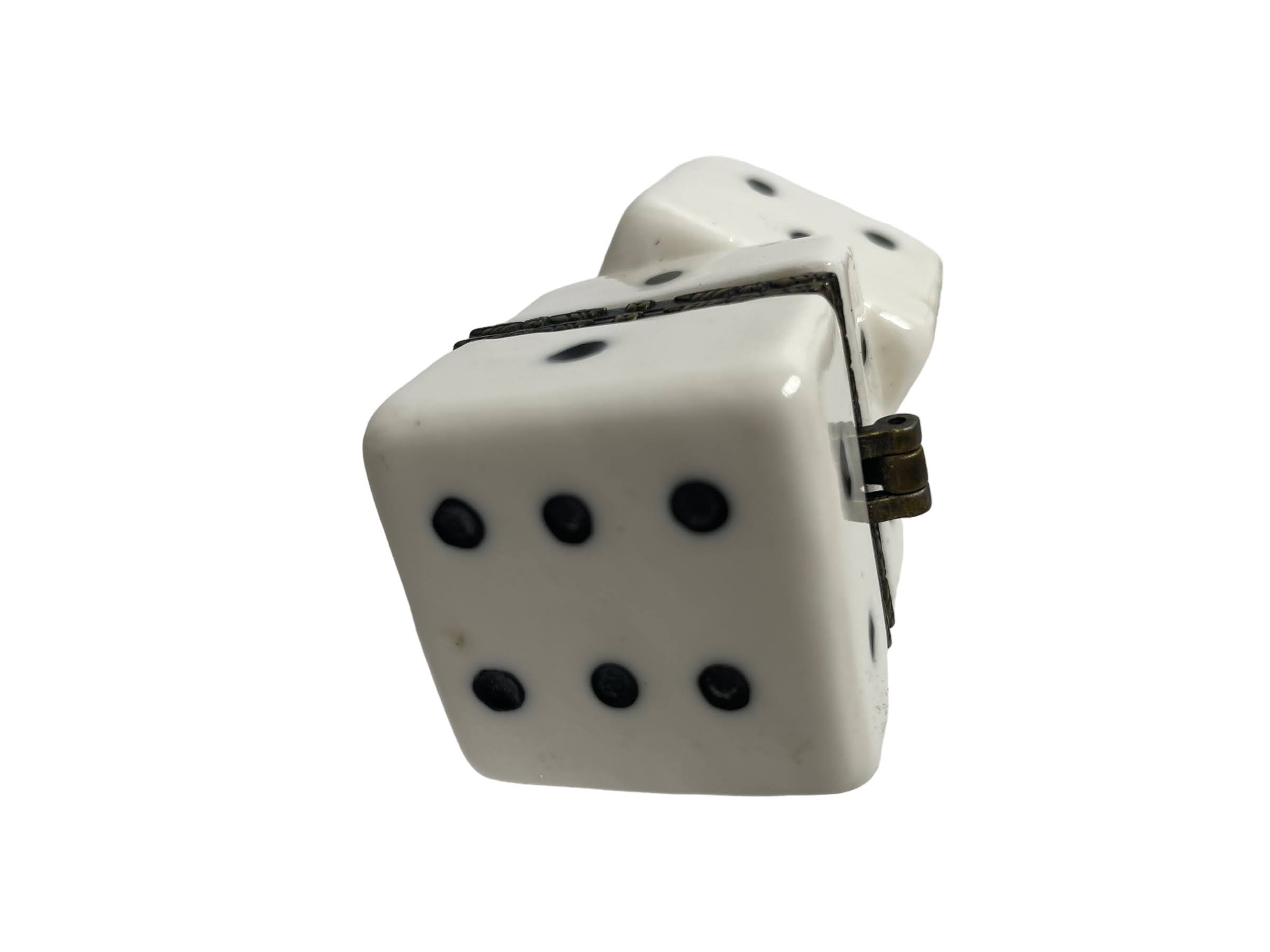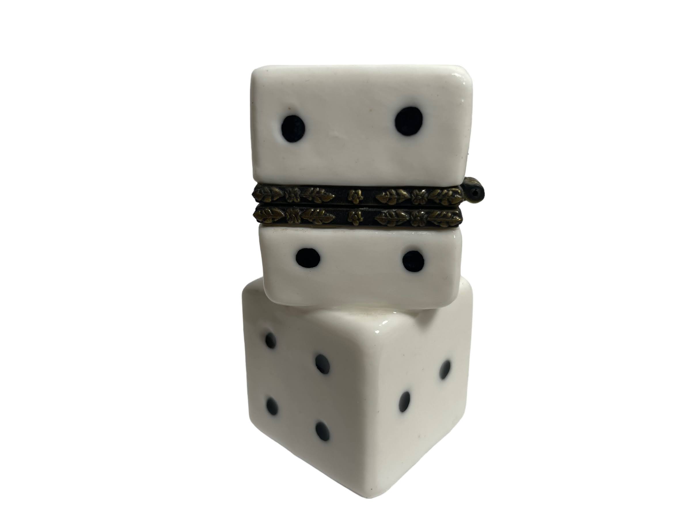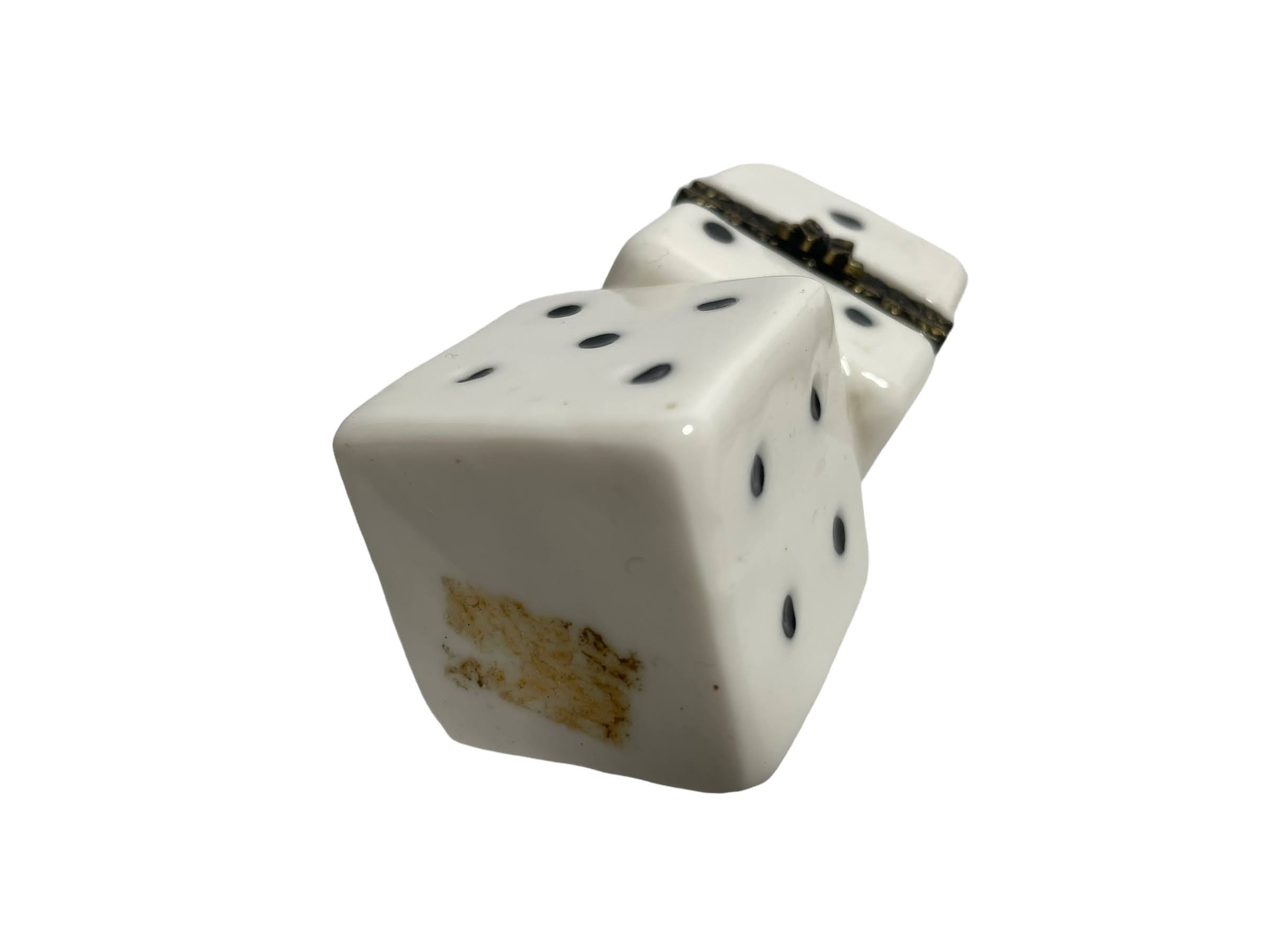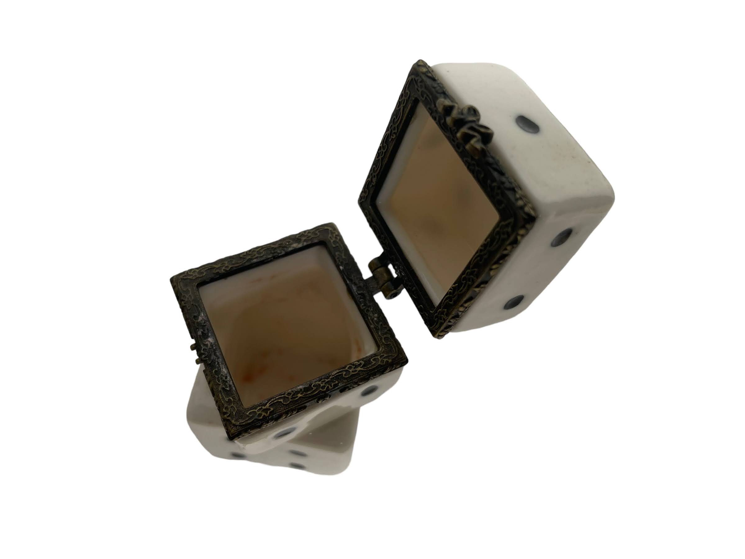 A vintage French sewing, trinket, jewellery or pill box. In the shape of two dice. Some signs of age as detailed below.