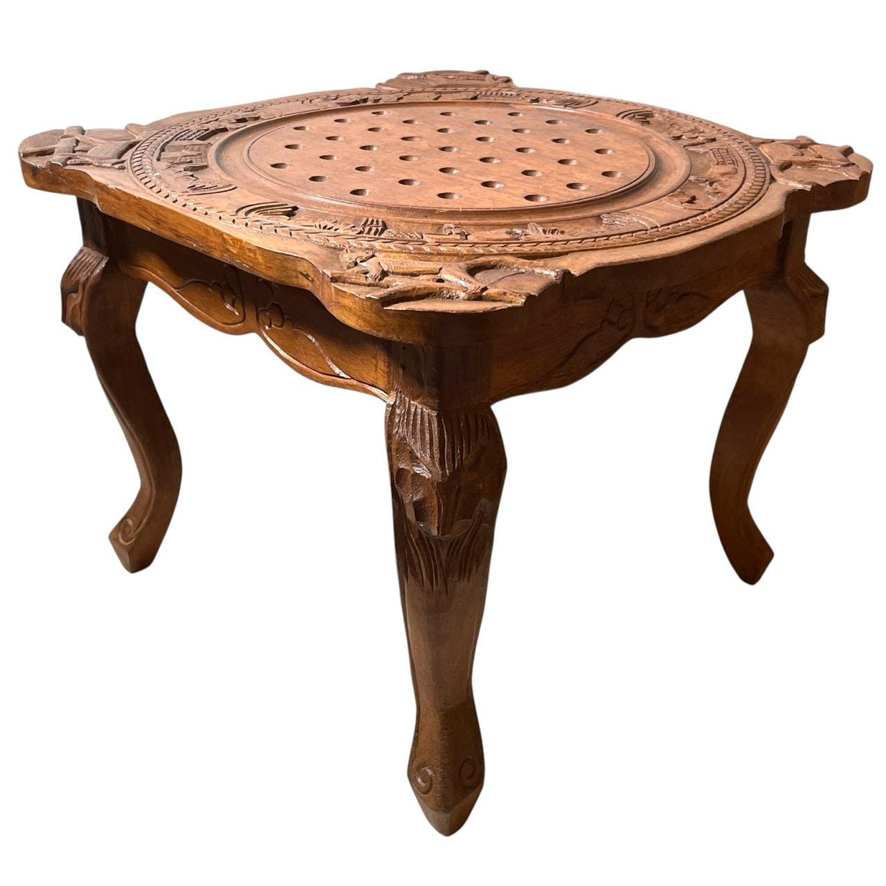 A vintage certainly Asian influenced little side table designed for solitaire use but we are not sure about origin. This one is in good structural condition (not built for very heavy use) and good cosmetic condition with some signs of age as detailed below.